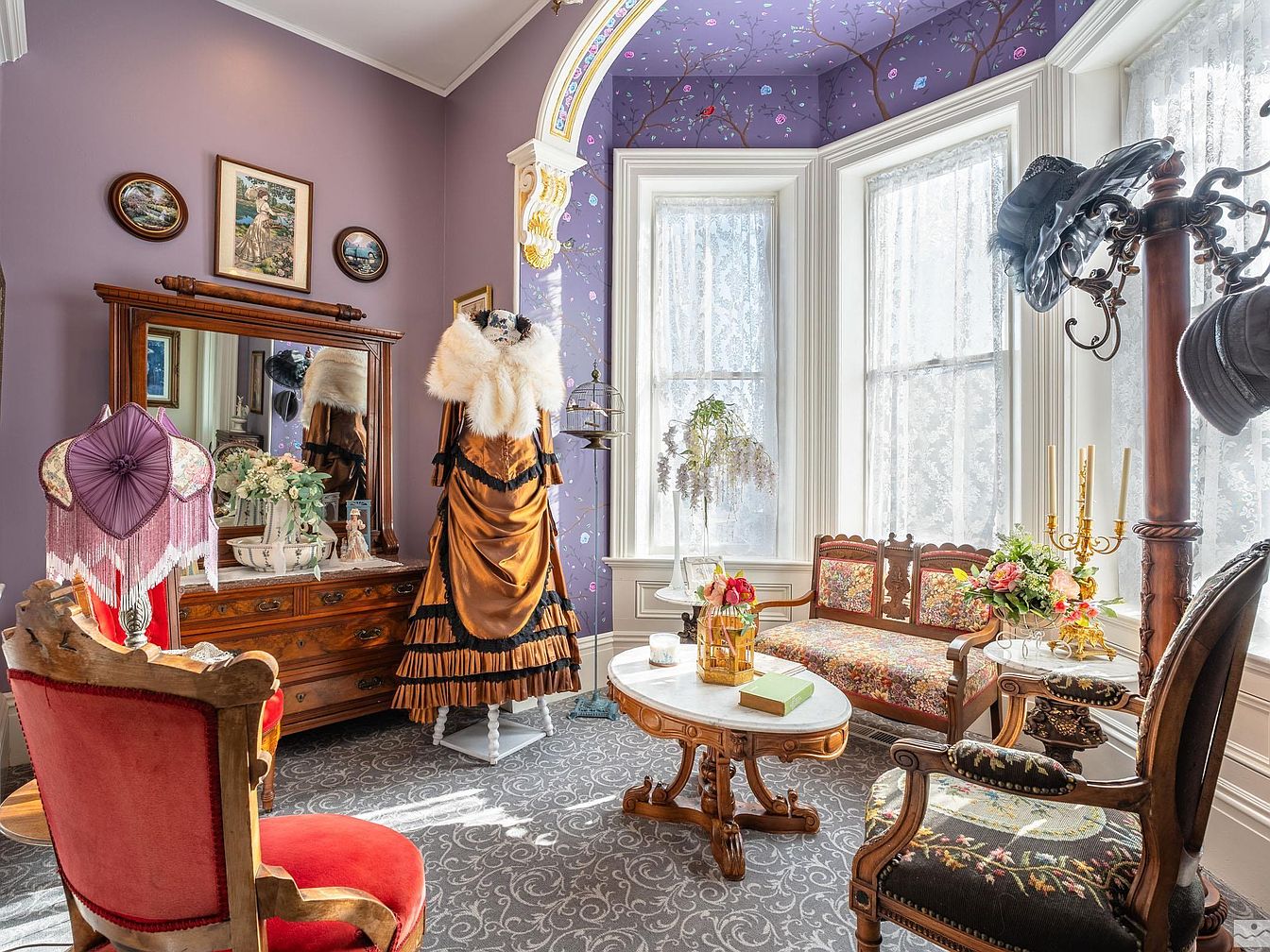 A charming Victorian-inspired sitting room adorned with lavender walls and ornate white trim, featuring a cozy bay window framed by lace curtains that welcome natural light. Antique wooden furniture with floral upholstery and carved details create an inviting space for family gatherings. The ceiling above the bay is whimsically decorated with tree branches and blossoms, complementing the room’s delicate color palette. A vintage dresser is topped with porcelain décor and surrounded by period accents such as a hat stand, costume display, and candelabras, evoking a sense of elegance and warmth, ideal for quiet reading or shared conversation.