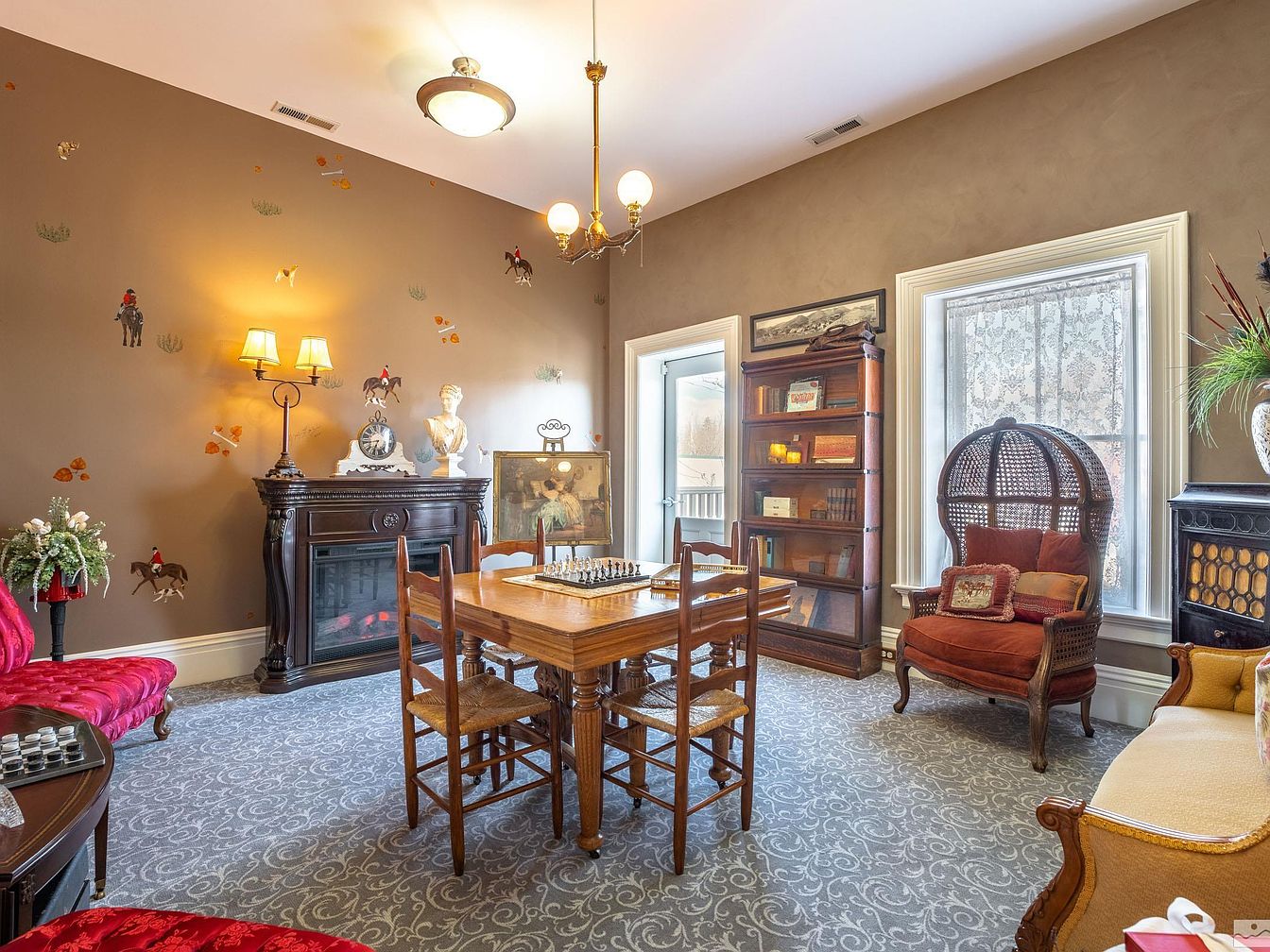 Warm earth tones and classic Victorian touches define this inviting game room, featuring an elegant carved wood fireplace and whimsical equestrian wall art perfect for sparking conversation. A central wooden table is set up for chess, surrounded by sturdy high-back chairs for family game nights or group activities. Ornate details such as the intricately patterned carpet, large picture windows with lace curtains, and tasteful antique shelving lend a comfortable, timeless atmosphere. The mix of plush red and gold seating includes a unique wicker chair, offering cozy nooks for reading or relaxing, making the space both family friendly and sophisticated.