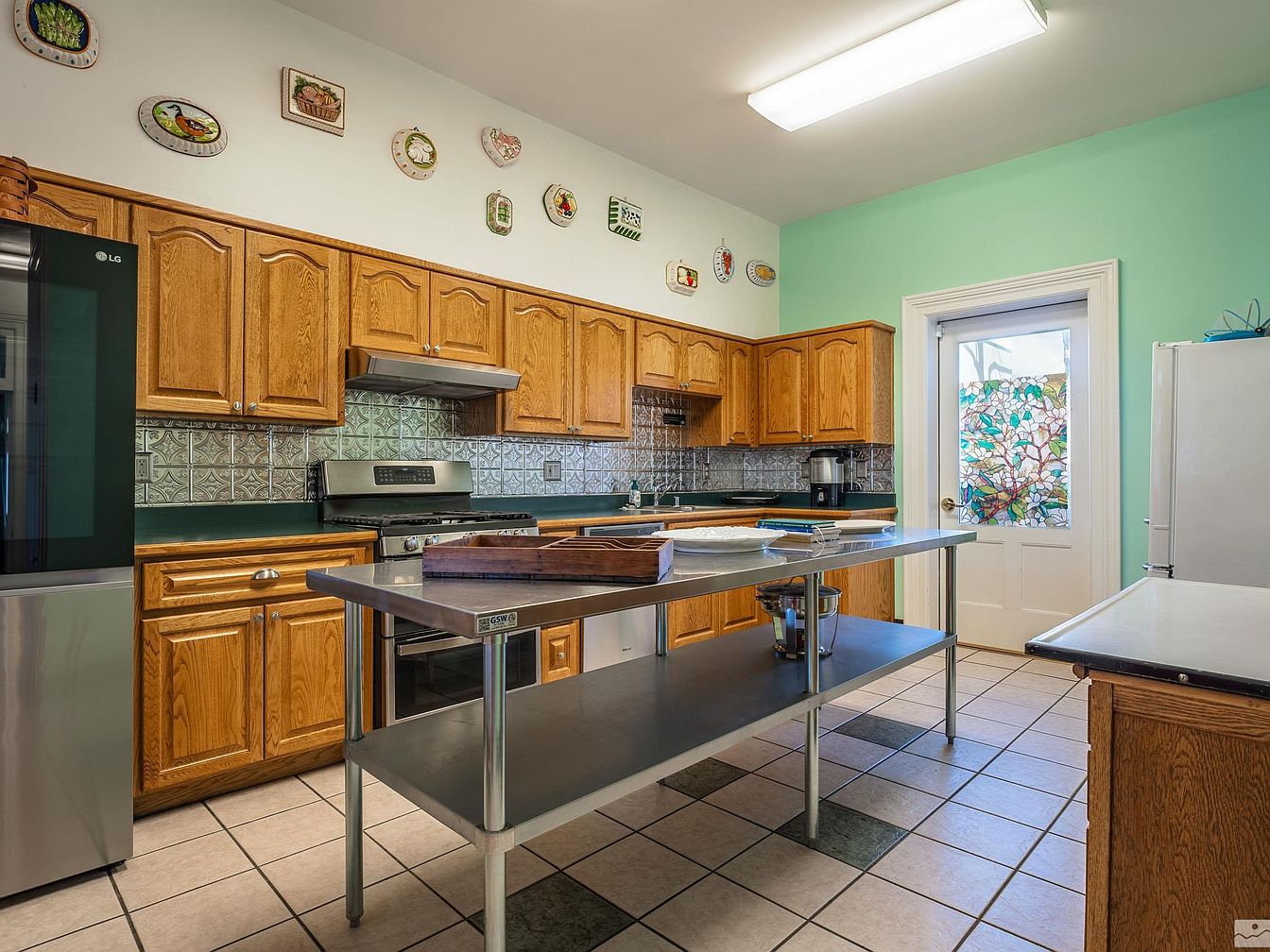 A welcoming, functional kitchen featuring warm oak cabinetry and an industrial-style stainless steel island, offering ample workspace for family cooking or casual gatherings. The soft mint wall contrasts elegantly with traditional wooden cabinets and a decorative tin backsplash, adding a touch of vintage charm. Family-friendly tile flooring ensures easy cleanups, while the layout provides generous storage and movement space, ideal for busy family routines. Playful plate décor above the cabinets highlights a personal touch, and a door with stained-glass detailing brings colorful natural light into the room, enhancing the cheerful, inviting atmosphere perfect for daily meals and shared moments.
