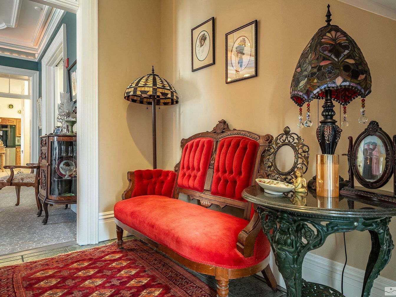 A welcoming entryway featuring an ornate carved wooden settee upholstered in plush red velvet, paired with a richly textured area rug that adds warmth and comfort. The space is adorned with antique-inspired furniture, including a decorative glass-topped side table and vintage Tiffany-style lamps that lend an inviting, family-friendly touch with their gentle glow. Neutral wall tones are complemented by elaborate framed portrait art, while white trim and detailed crown moldings enhance the classic aesthetic. This cozy nook gracefully introduces visitors to the home’s historic elegance while offering a practical, comfortable spot for moments of pause.