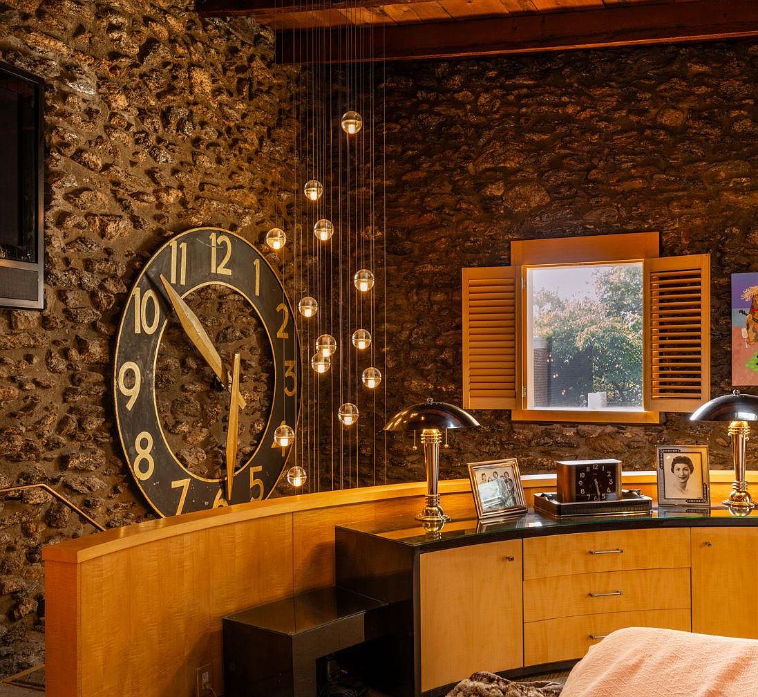 Warmth and personality fill this cozy bedroom corner, highlighted by a striking stone accent wall and a giant decorative clock that serves as a bold focal point. The space balances rustic textures with modern touches, featuring a curved maple wood desk topped with elegant black lamps, framed family photos, and a classic clock, all beneath a picture window with traditional wooden shutters. Glass pendant lighting hangs in a graceful vertical line, adding ambient light and visual interest. Earthy tones, layered textiles, and family memorabilia make this corner both inviting and personal, a perfect retreat for comfort and togetherness.