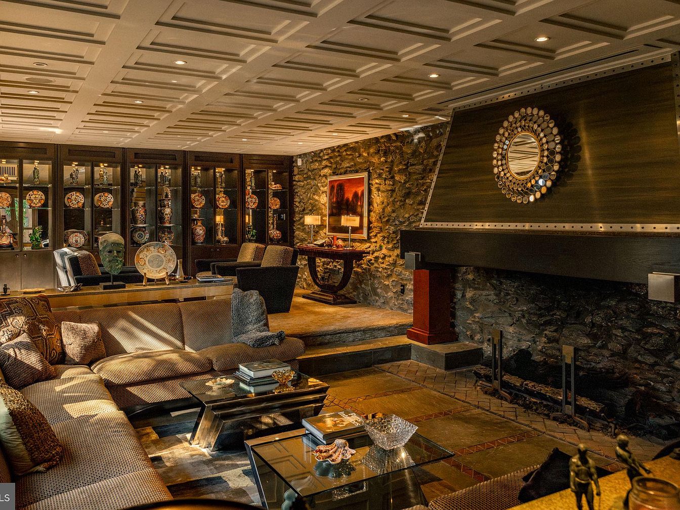 A spacious sunken living room features a sophisticated blend of modern and rustic elements, accented by a dramatic stone fireplace and an eye-catching metallic mantel with a circular mirror. The seating area is anchored by a plush sectional, perfect for family gatherings, and flanked by inviting armchairs facing glass coffee tables. Warm neutral tones highlight the cozy atmosphere, while the paneled ceiling and built-in illuminated display cabinets lend elegance and organization, ideal for showcasing collectibles. The room’s open layout and soft lighting create an inviting space, making it both functional and visually striking for family life and entertaining guests.