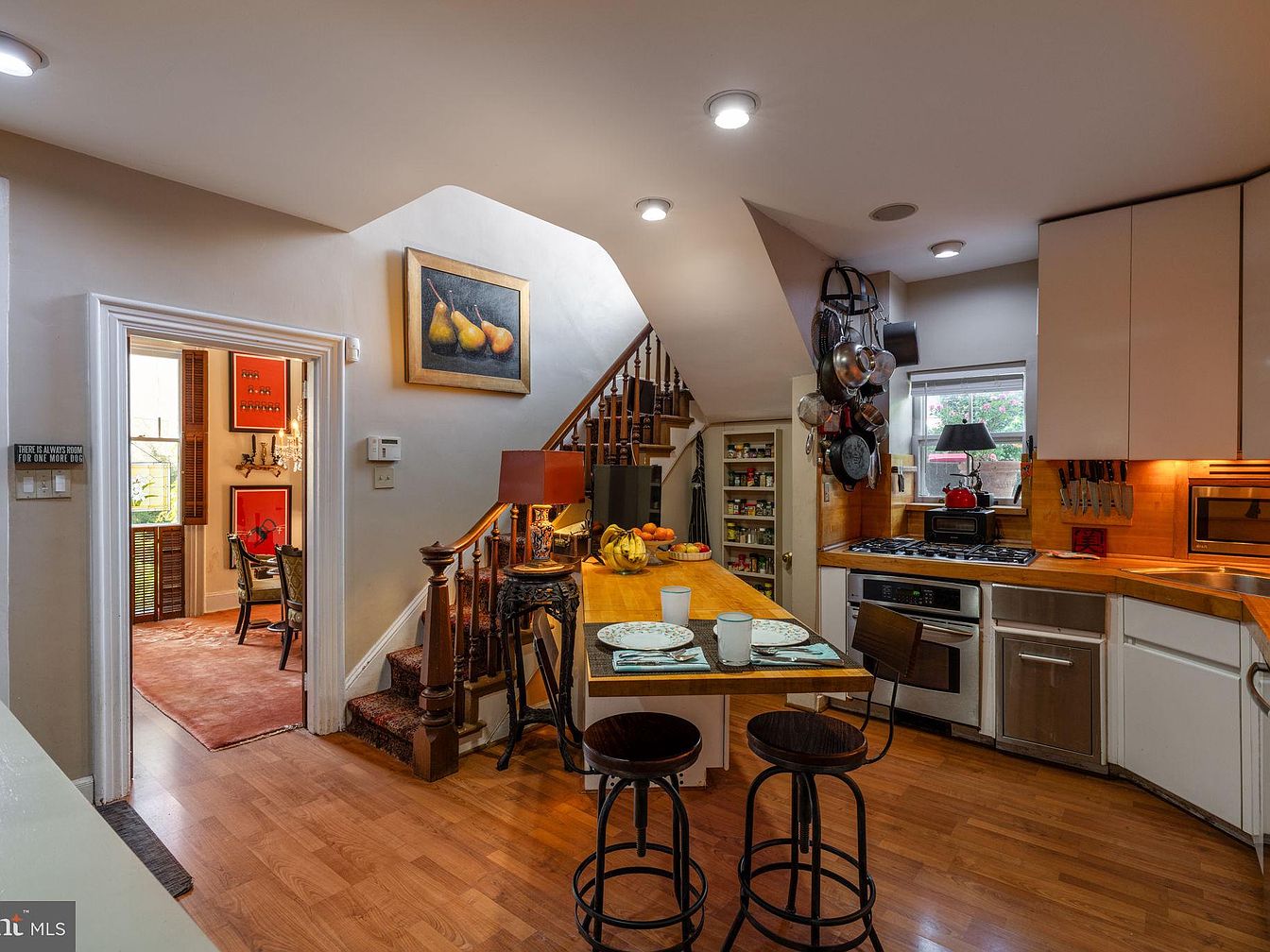 A warm, inviting kitchen with a cozy breakfast bar at its center, featuring two stools and set for a casual meal. White cabinetry and natural wood countertops create a bright and timeless look, complemented by stainless steel appliances and under-cabinet lighting. The kitchen is organized and functional, with pots, pans, and utensils within easy reach and a pantry tucked neatly beneath the stairs. The open layout allows for visibility and interaction with the adjacent dining room, making it ideal for family gatherings. Touches like fresh fruit, pendant lighting, and artwork lend a personalized, family-friendly charm to the space.