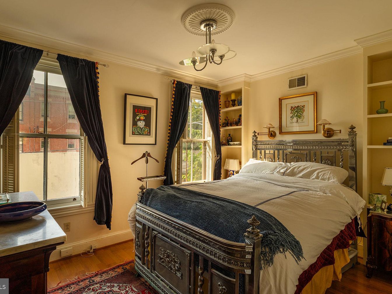 Warm sunlight softly fills this inviting bedroom, creating a cozy and elegant atmosphere. A grand, ornately-carved metallic bedframe takes center stage, complemented by crisp white bedding and a luxurious navy throw. Built-in shelves with a golden accent house family memorabilia and colorful pottery, blending function and aesthetic appeal. Tall windows, framed with plush navy curtains, allow for abundant natural light and provide a view of the surrounding neighborhood. Tasteful artwork and vintage lighting fixtures add a curated touch, while hardwood flooring and a rich patterned rug complete the timeless, family-friendly space with layers of comfort and personal character.