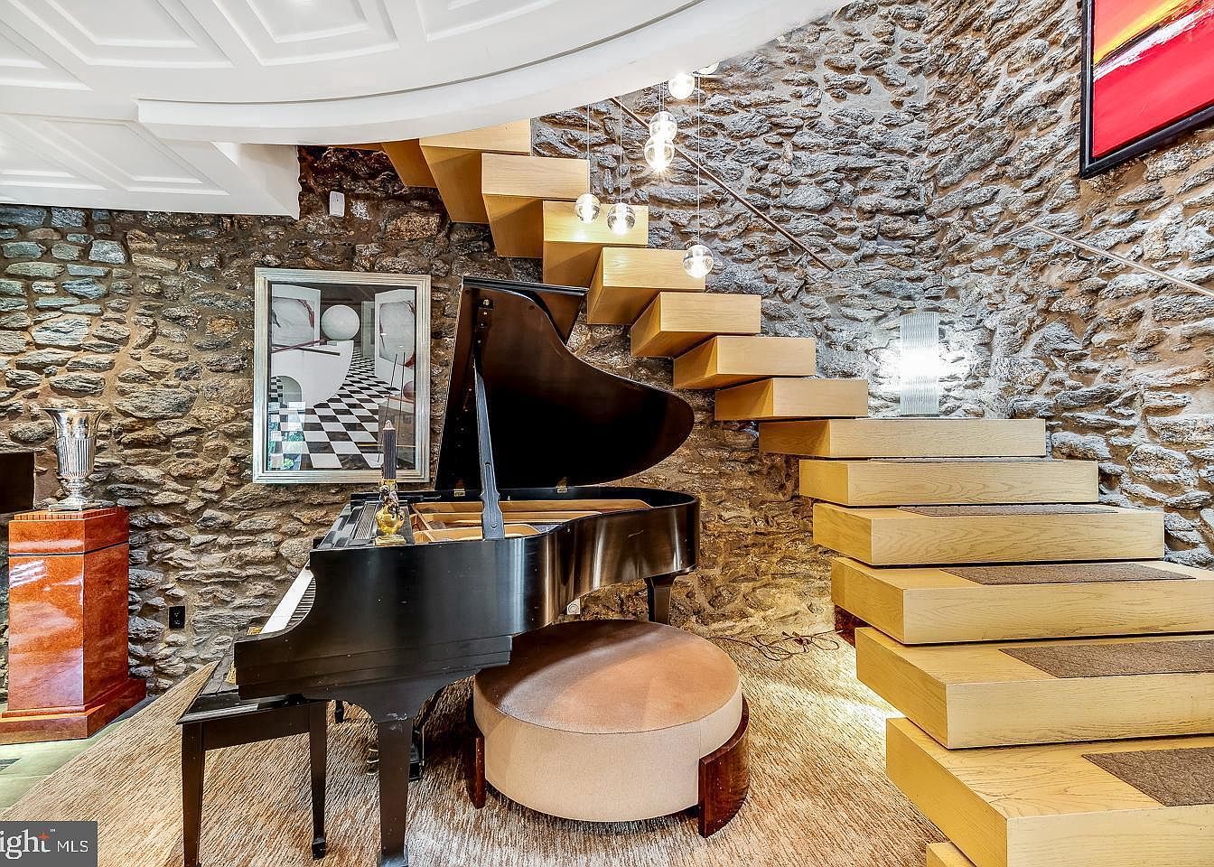 A striking floating staircase with broad wooden treads creates a sculptural focal point, blending seamlessly into a textured stone wall that radiates warmth and rustic charm. Beneath the stairs sits a grand piano paired with a plush, circular stool, inviting for both family gatherings and quiet, creative moments. Modern pendant lights hang above, providing soft, ambient illumination and a whimsical touch. Contemporary art and sleek furniture pieces enhance the space’s sophistication, while the soft-toned carpeting adds comfort. This area effortlessly combines old-world stone architecture with modern elegance, making it a welcoming, multifunctional spot for families and guests alike.