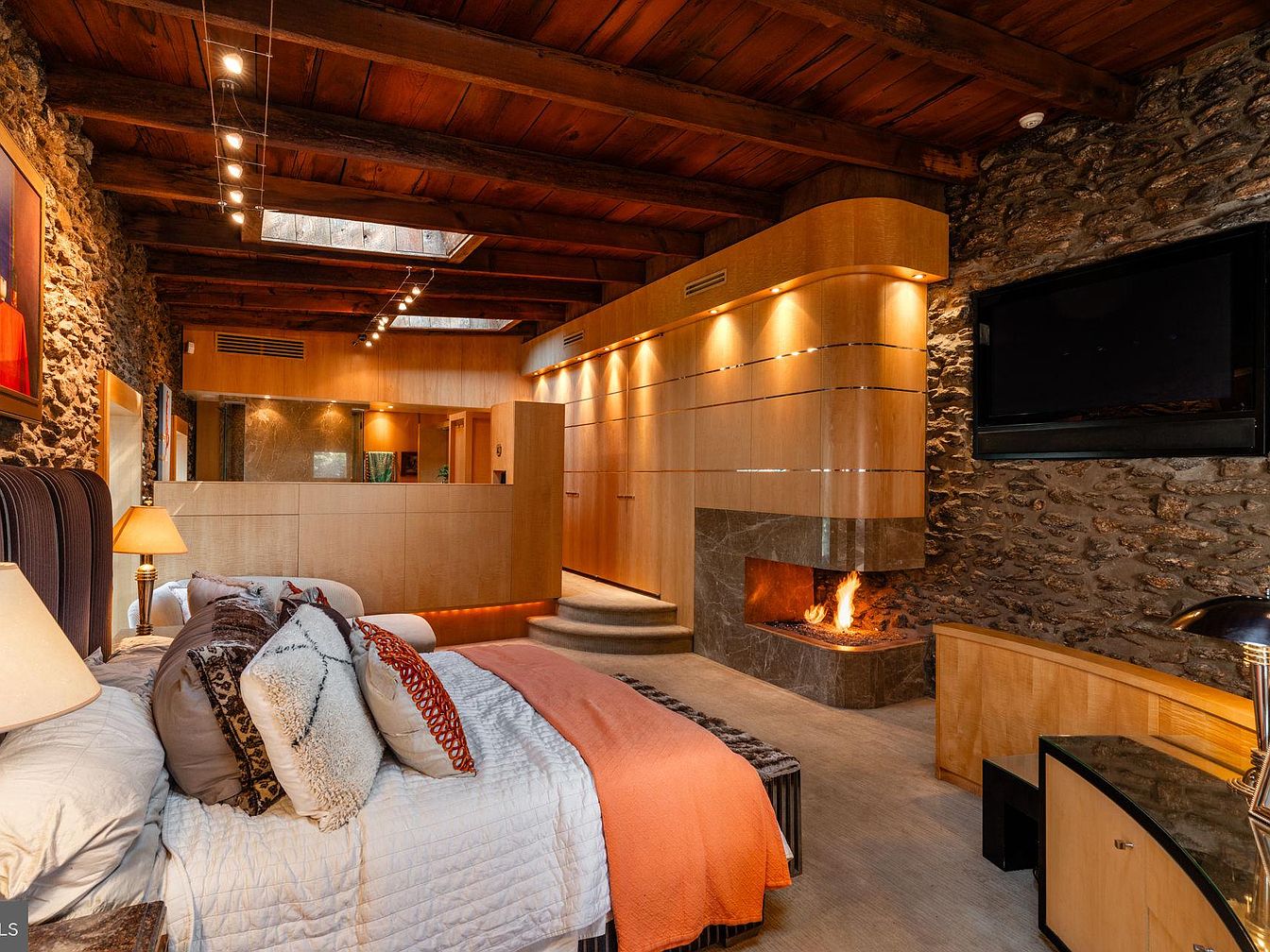 A warm, inviting master bedroom adorned with natural textures and cozy details. Stone walls and a wood-beamed ceiling create a rustic yet modern ambiance, balanced by sleek, built-in cabinetry and a curved, illuminated accent wall. The room features a plush bed with layered pillows and throws, perfect for family snuggles. Built-in storage and a spacious layout provide ample room for relaxation and functionality. The glowing fireplace adds comfort for chilly evenings, while recessed lighting and skylights brighten the space. Soft earth tones, accented with pops of orange and textured fabrics, contribute to an atmosphere of comfort and family-friendly elegance.