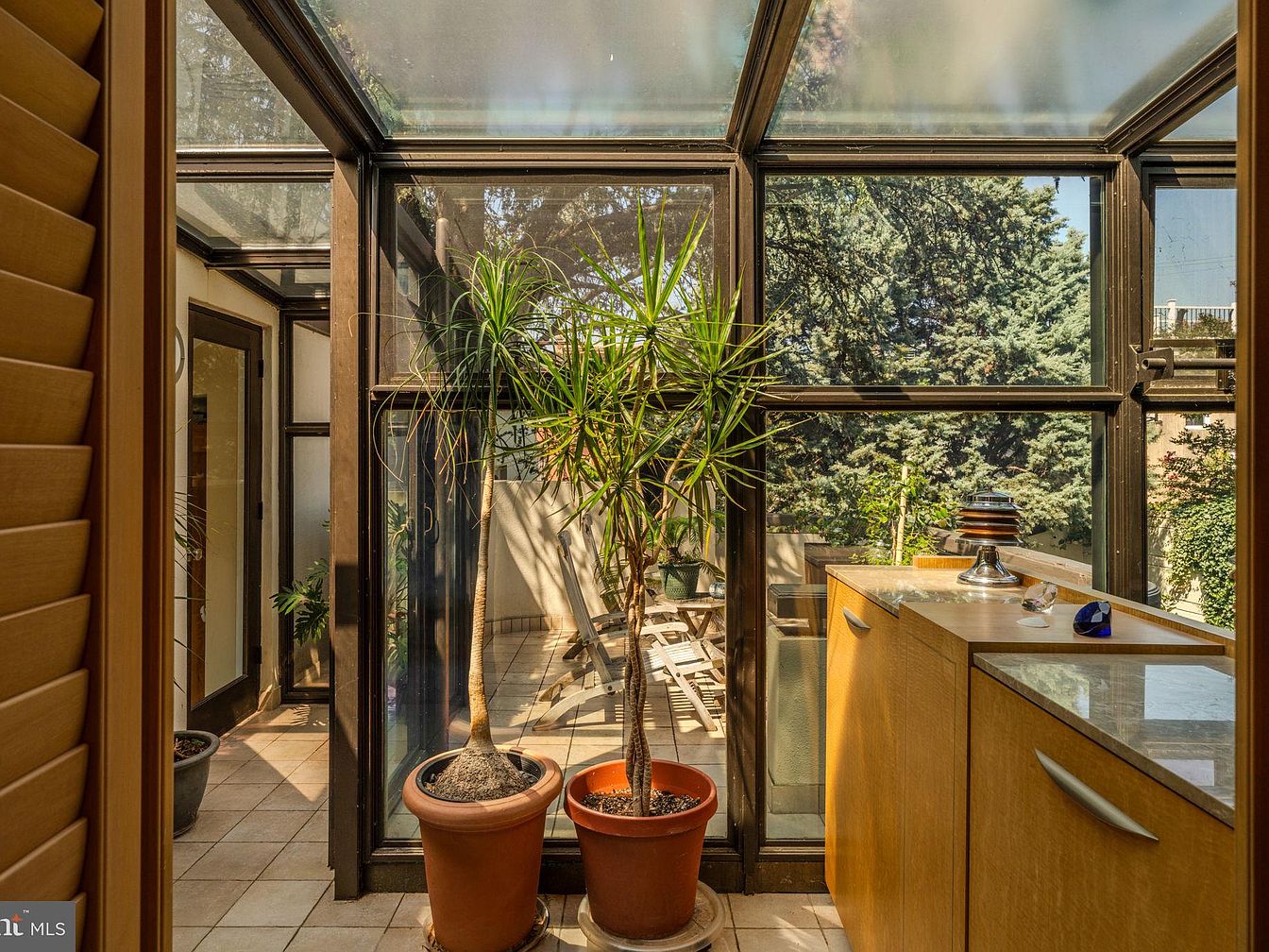 Flooded with natural light, this enclosed sunroom perfectly blends indoor comfort with the beauty of the outdoors. A glass ceiling and large windows create an airy, open atmosphere, while the earthy tile flooring grounds the space. Potted plants bring a touch of verdant nature indoors, making the area feel refreshing and serene. The built-in cabinetry with contemporary handles offers storage and an inviting display surface for family treasures. Warm wood accents and neutral tones enhance the soothing ambiance, making this an ideal spot for family gatherings, reading, or simply relaxing while enjoying views of the surrounding greenery.