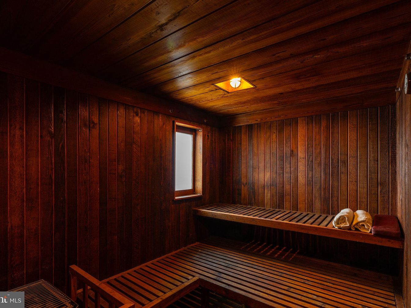 This inviting home sauna blends warmth and relaxation with its beautifully crafted wood-paneled walls and ceiling, creating a tranquil escape within the house. The warm brown hues of the stained wood provide a soothing ambiance, complemented by soft, indirect lighting from a ceiling fixture. Spacious slatted benches comfortably accommodate multiple family members for shared wellness experiences. A modest window allows gentle natural light, preserving privacy while offering ventilation. Thoughtful touches, such as neatly rolled towels, add a sense of hospitality and care, making this a perfect feature for family downtime and luxurious self-care moments in a health-focused home.