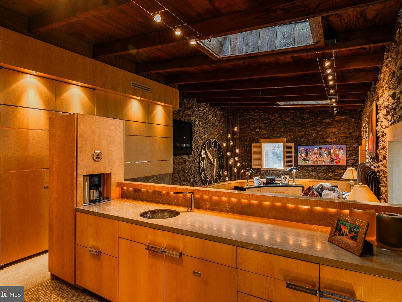 Warm wood cabinetry and stone walls create a cozy, earthy atmosphere in this spacious open concept family room and kitchen area. Sleek recessed lighting and a skylight overhead allow for an abundance of natural and artificial light, while the raw wood ceiling beams add rustic charm. The kitchen features a built-in coffee station, marble countertops, and modern fixtures. Family-friendly seating is gathered around a central nook, ideal for relaxing or entertaining. Child-focused artwork and large wall clocks lend a playful yet welcoming vibe, and the thoughtful layout allows children to enjoy the space while adults cook or socialize nearby.