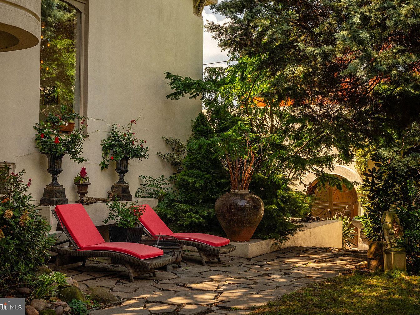 Nestled alongside the house, this serene garden lounge invites relaxation with a pair of red-cushioned chaise lounges set atop natural stone pavers. Lush greenery surrounds the area, including large, mature trees that offer ample shade and privacy, perfect for family gatherings or quiet afternoons. Elegant urn planters brimming with blooming flowers introduce color and texture, complementing the neutral exterior wall and earth-toned pot accents. Carefully arranged landscaping softens the space, while the arched wooden gate at the back hints at further garden adventures. The blend of natural elements and comfortable seating creates a welcoming retreat for all ages.