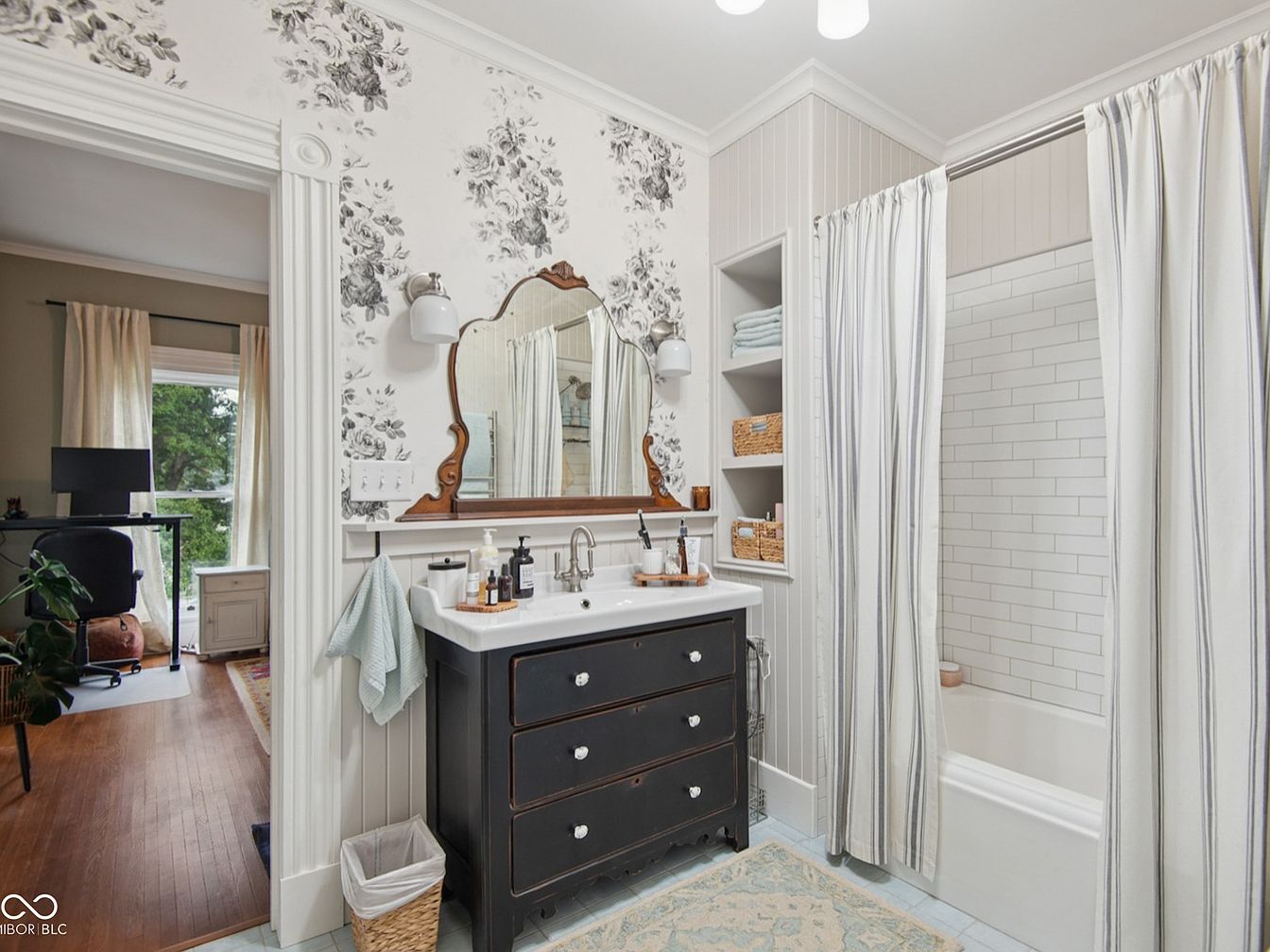 A warm and inviting bathroom featuring a vintage-inspired black vanity with ample drawer space and a classic porcelain sink. The space is defined by a floral wallpaper accent wall and crisp beadboard paneling, lending an elegant, timeless feel. A large, ornately-carved mirror above the sink enhances natural light, while built-in shelves with baskets and neatly folded towels offer both storage and family-friendly convenience. The white subway-tiled bathtub is concealed by a soft striped curtain for privacy. Soft, neutral tones and refined details create a soothing atmosphere suitable for families, blending comfort with sophisticated design.