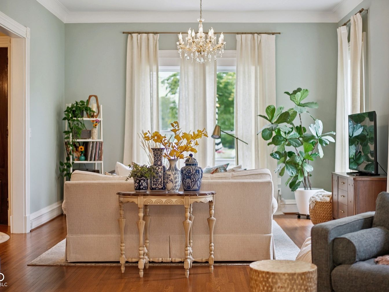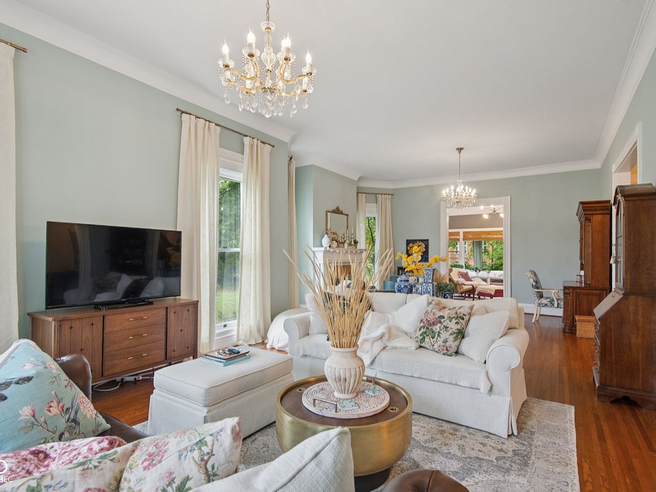 A spacious living room combines elegant traditional design with charming, family-friendly comfort. Soft sage green walls are complemented by crisp white trim and large windows, flooding the area with natural light. An inviting arrangement of plush, light-colored sofas adorned with floral and neutral accent pillows creates a welcoming gathering space, perfect for entertaining or relaxing with loved ones. The area is anchored by a textured rug and a stylish round coffee table, while gleaming wooden floors add warmth throughout. Decorative touches such as crystal chandeliers, vintage cabinets, and delicate vases enhance the timeless, homey ambiance ideal for family interaction.