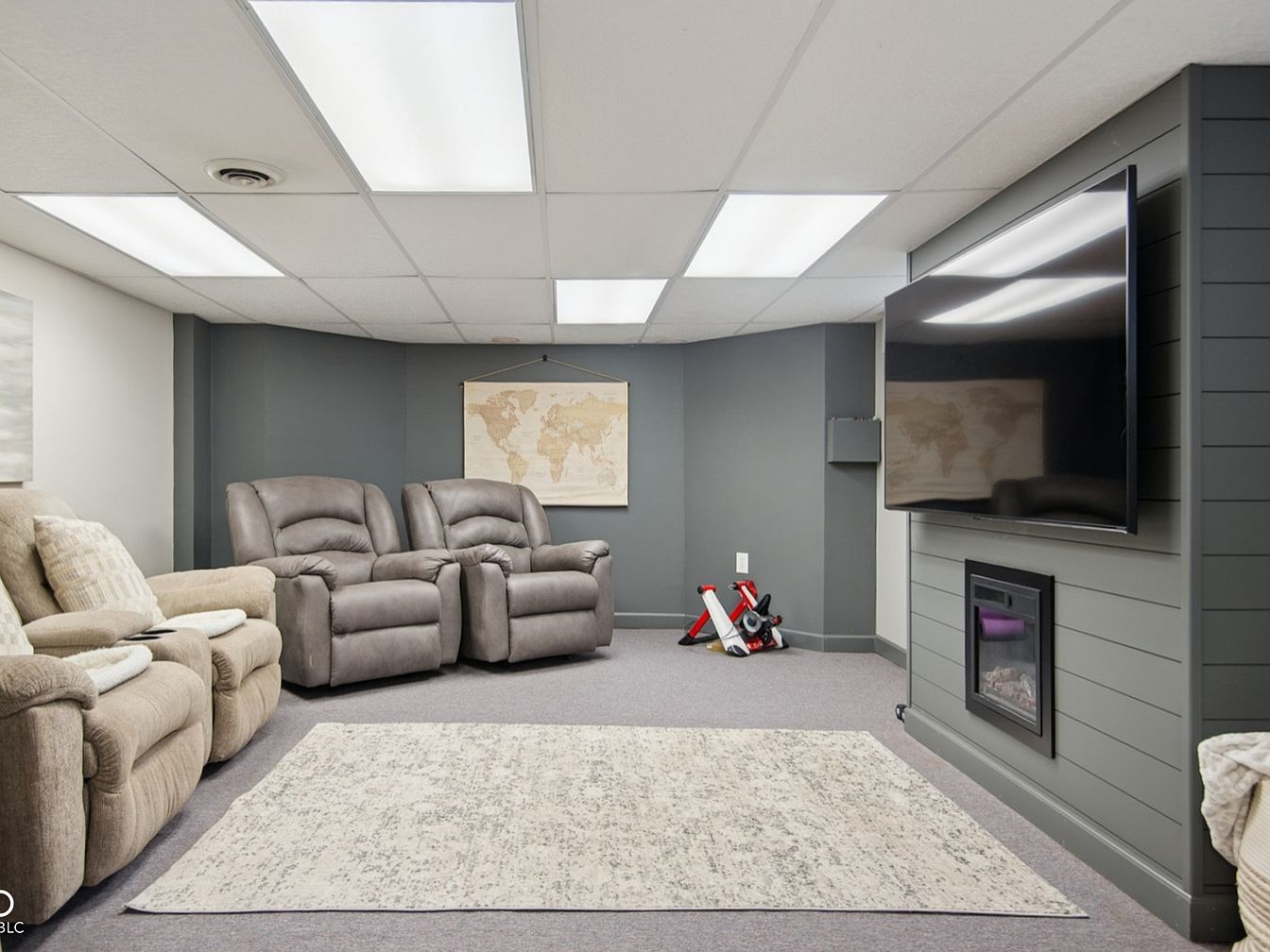 A modern basement media room featuring cozy reclining armchairs in soft beige and grey tones, perfectly arranged for movie nights and family gatherings. The space is anchored by a contemporary fireplace beneath a large wall-mounted TV, framed in sleek slate paneling. Warm ambient lighting from ceiling panels ensures a bright, welcoming atmosphere. A textured area rug adds comfort and warmth underfoot, while neutral walls provide a relaxing backdrop with subtle pops of color. A framed world map accentuates the wall, adding a touch of sophistication. The presence of plush throws and a small toy suggests a space designed for both relaxation and family-friendly fun.