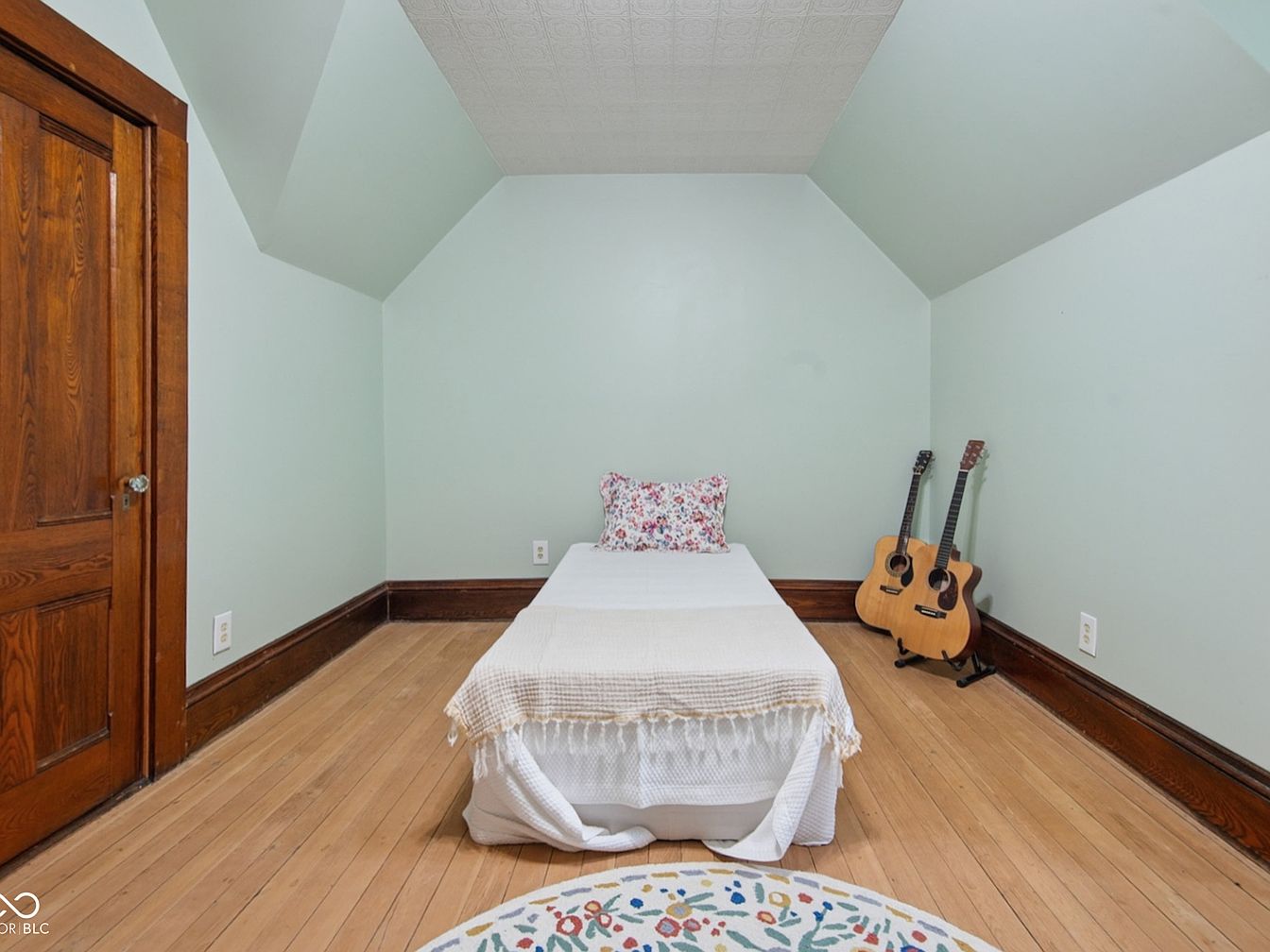 This inviting bedroom features soft mint-green walls and sloped, angled ceilings, giving the space a charming, intimate feel perfect for relaxation. Natural wood trim and a solid wood door provide warmth and classic character, beautifully complementing the light wooden floors that run throughout the room. A single bed with a textured beige throw and a floral pillow sits neatly against the back wall, making the space feel open yet comfortable. Two acoustic guitars rest in the corner, adding a touch of personality and encouraging creativity, a wonderful touch for families with budding musicians. Subtle, family-friendly details, including a whimsical patterned area rug, complete the tranquil atmosphere.