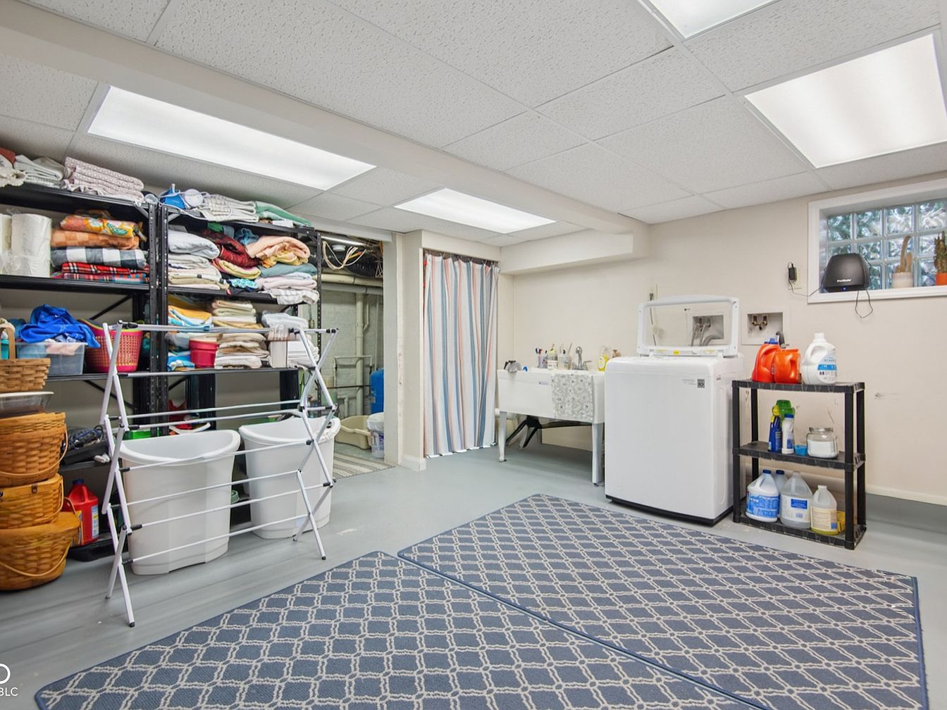 A spacious and practical laundry room, this area features ample open shelving filled with neatly folded linens, baskets, and laundry essentials, offering both organization and easy access for every family member. The neutral, bright color palette, combined with white ceilings and walls, enhances the natural light streaming through the small window. Functional touches such as a large top-loading washing machine, a drying rack, and deep laundry sinks support active family use. Durable built-in rugs and simple utility shelving make this a kid-friendly, high-traffic space, while a curtain adds a soft divider for a touch of privacy and separation.
