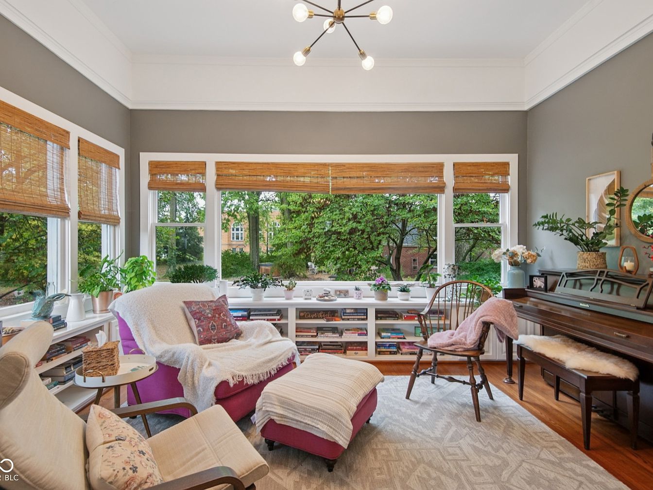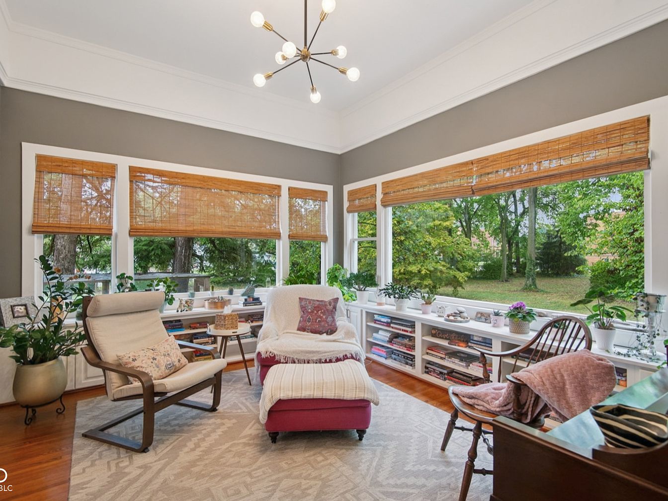 A cozy corner designed for relaxation and family gatherings, this sunlit space features expansive windows framed by natural bamboo shades, offering calming views of the lush garden. Soft, earth-toned walls and a plush area rug create a warm ambiance, complemented by a mix of comfortable seating options including an inviting armchair and an upholstered ottoman. Floor-to-ceiling built-in shelves house an array of books and decorative items, promoting both leisure and creativity for all ages. Flourishing houseplants line the windows, adding greenery and freshness, while the modern chandelier above enhances the room’s inviting, uplifting character.