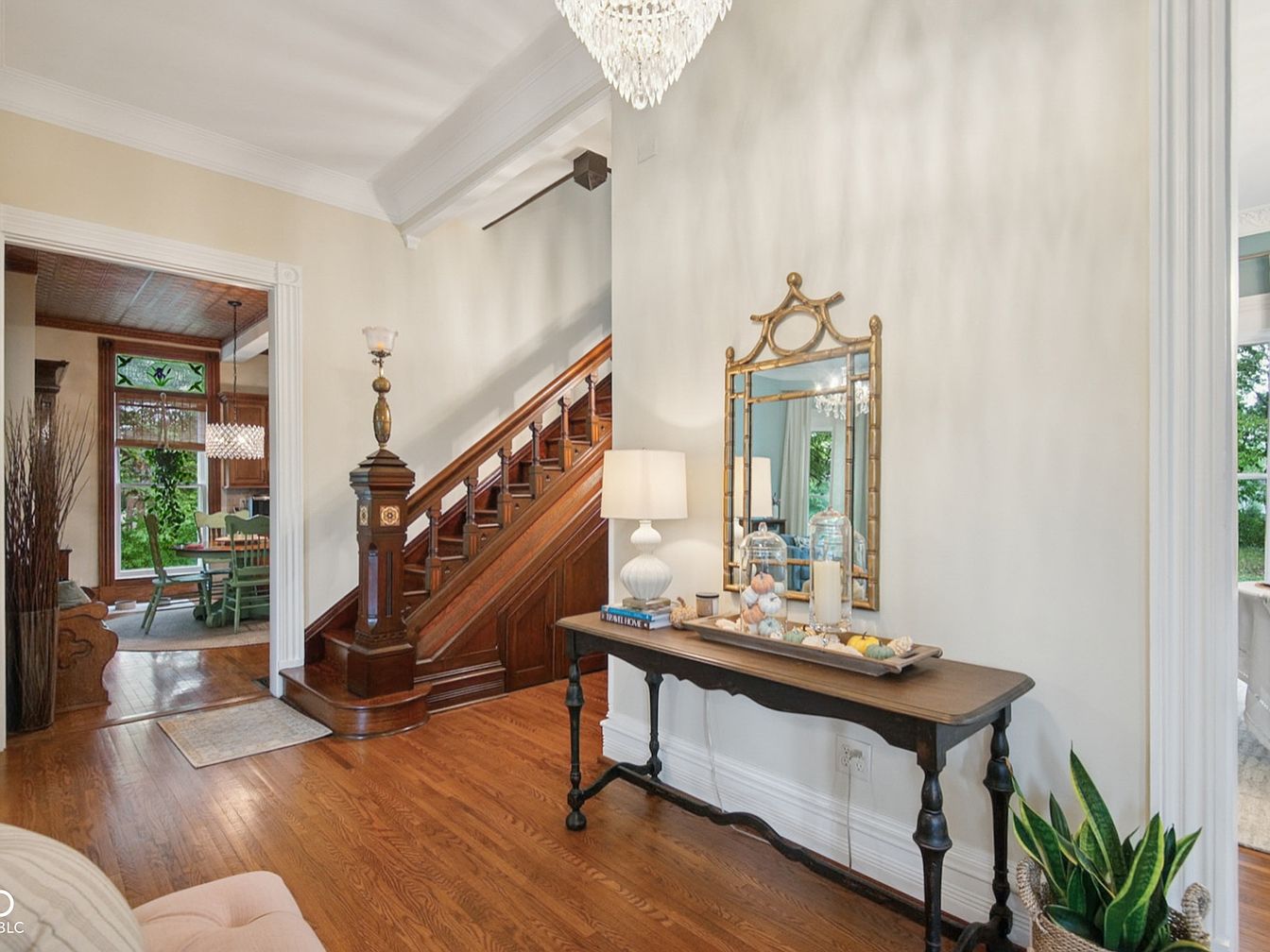 This inviting entryway features a classic staircase crafted from rich wood, creating an elegant focal point as you enter the home. Soft neutral walls pair beautifully with warm hardwood floors, enhancing the space’s welcoming ambiance. A dark wood console table adorned with decorative vases, an ornate mirror, and soft lighting adds both style and practicality, perfect for families to drop keys or mail. The open layout flows naturally into a dining area with abundant natural light, visible through the adjoining doorway. Crown moldings, period details, and a chic chandelier add to the timeless, family-friendly charm of this thoughtfully designed space.