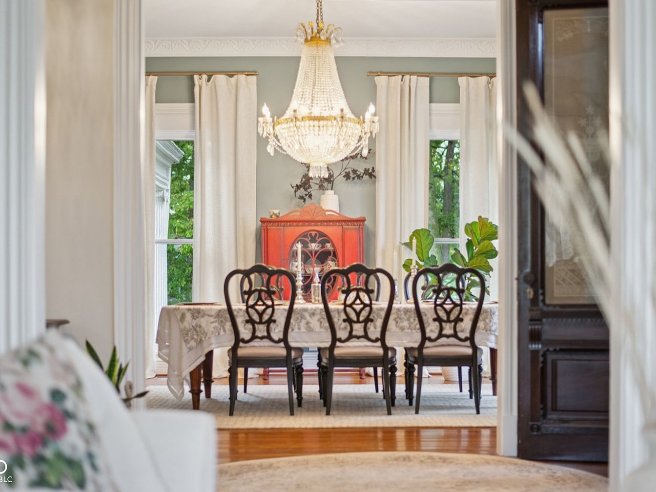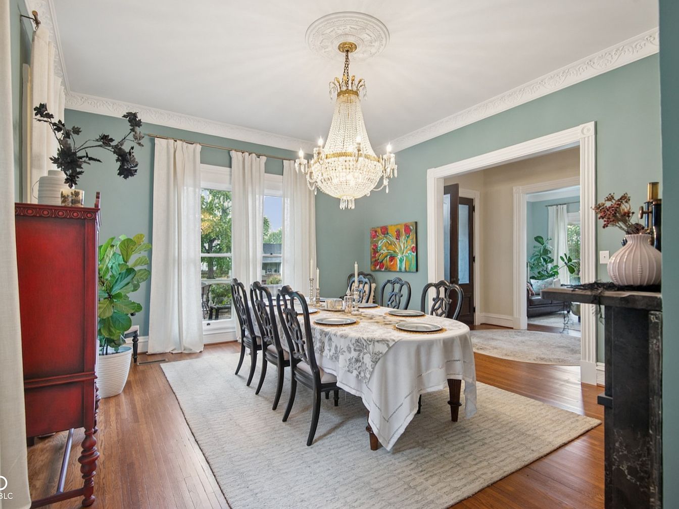 Elegant and inviting, this formal dining area features a long wooden table with seating for eight, perfect for family gatherings and festive dinners. The soothing sage-green walls pair beautifully with crisp white trim and intricate ceiling molding, setting a refined tone. A dazzling chandelier anchors the room, adding a touch of glamour, while large windows framed by airy, white curtains bathe the space in natural light. Rich hardwood floors and a plush cream rug enhance comfort and warmth. Classic dark wood furnishings, greenery, and colorful artwork create a sophisticated yet welcoming environment ideal for both special occasions and everyday meals.