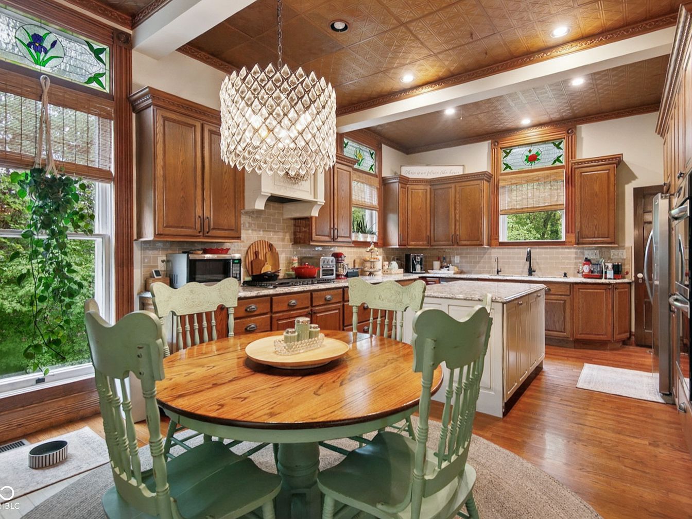 A spacious and inviting kitchen merges seamlessly with a cozy dining nook, perfect for family gatherings. The space features a warm color palette of earthy browns and soft greens, evident in the vintage-inspired wooden cabinetry and pastel-painted chairs. Large windows with stained glass transoms allow natural light to fill the room, enhancing the homey atmosphere. A large, round table encourages conversation, while the elegant crystal chandelier overhead adds a touch of sophistication. Practical amenities such as double ovens, ample counter space, and a wide kitchen island promote functionality, making this room equally suited for everyday living and special occasions.