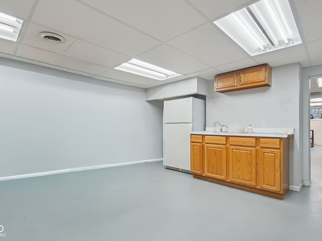 A functional basement kitchenette features clean lines and a minimalist design, ideal for flexible family living or entertaining. The light gray walls and matching vinyl flooring create a bright, airy atmosphere, while the drop ceiling with fluorescent lighting ensures the space is well-lit. Warm wood cabinetry provides storage above and below the countertop; the cabinets are both practical and inviting in tone. The kitchenette comes equipped with a full-size refrigerator and a sink, perfect for casual meals, snacks, or small gatherings. The open floor plan and absence of obstacles make it safe and accessible for all family members, including children.