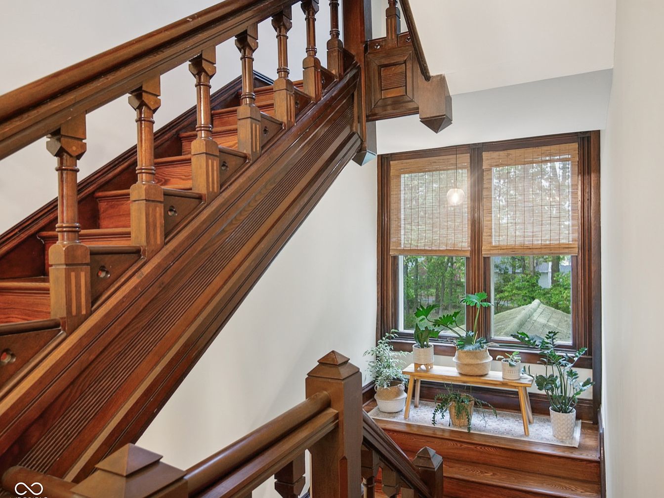 This charming staircase landing features beautifully crafted wooden banisters and steps that exude historic character. Sunlight streams through large, double-pane windows framed by rich wood trim, casting a warm glow over the space. A simple wooden bench anchors a collection of potted houseplants, adding a fresh, lively element to the landing. The natural light and greenery create a welcoming, family-friendly nook perfect for reading or birdwatching. The neutral walls complement the deep hues of the wood, balancing traditional architectural details with a contemporary touch, making it a cozy and practical space for everyday enjoyment.