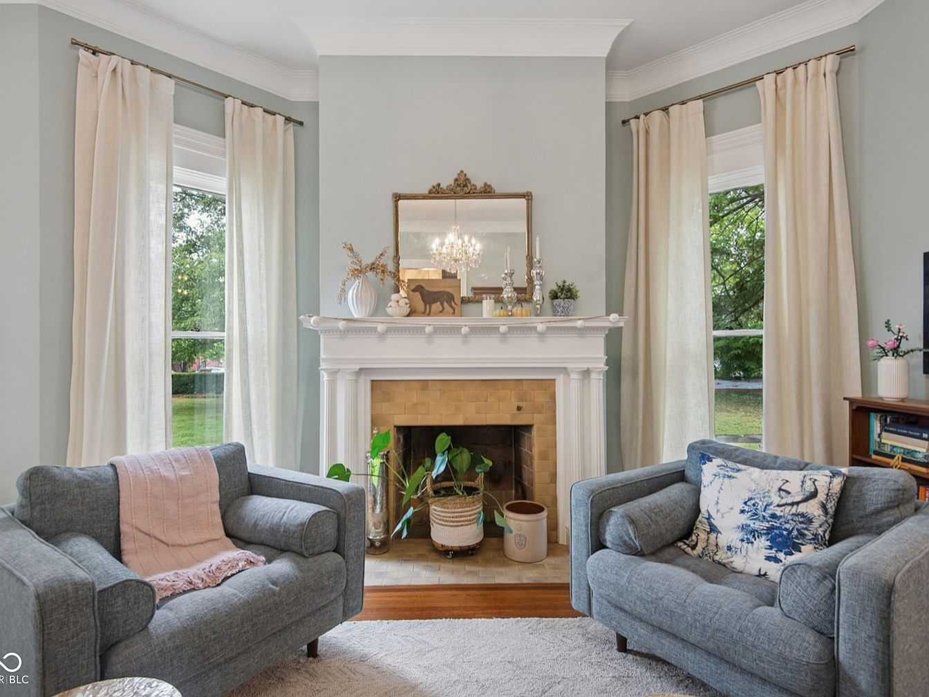 A cozy living room corner centers around a traditional brick fireplace with a white mantel, adorned thoughtfully with vases, candles, and a vintage mirror. Soft blue walls offer a calming backdrop, enhanced by two large windows on either side that bring in abundant natural light. The seating area features two light gray armchairs with plush cushions, one draped in a blush throw and the other accented with a blue botanical pillow for a touch of freshness. Pale beige curtains frame the windows, warming the space. A soft area rug provides comfort underfoot, inviting families to gather and relax together.