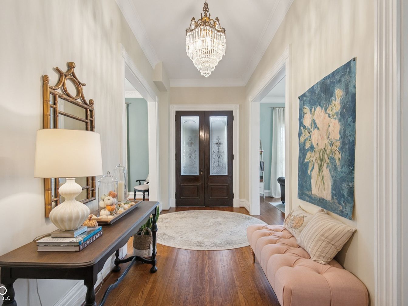 A welcoming entryway features warm hardwood flooring and high ceilings that create an inviting first impression. Soft cream walls are accented by elegant white trim, while a statement chandelier brings a touch of luxury to the space. On one side, a tufted blush bench with accent pillows provides a comfortable spot for seating, ideal for families with kids needing a place to remove shoes. A contemporary table with a classic mirror and decorative lamp offers both style and practicality, complemented by seasonal décor and books. Artwork and soft area rugs contribute to the homely ambiance, balancing sophistication with everyday comfort.