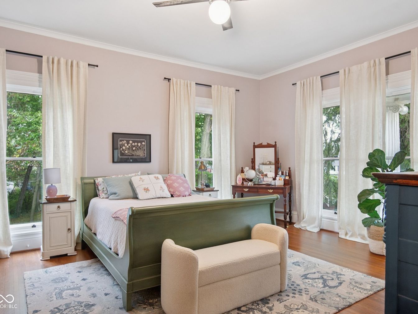 This inviting primary bedroom features soft lavender walls and large windows draped with creamy linen curtains, allowing natural light to fill the space and create a tranquil atmosphere. A sturdy green sleigh bed adorned with pastel floral pillows sits atop a patterned area rug, adding warmth and classic character. Wooden floors, vintage-style side tables, and a traditional vanity provide practical, family-friendly touches, making the room feel both elegant and lived in. Thoughtful accents like a cozy upholstered bench, charming table lamp, and a leafy potted plant complete this restful retreat, ideal for unwinding after a busy day.