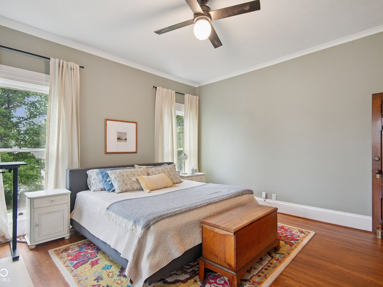 A spacious bedroom features soothing sage-green walls and large windows dressed in light, airy curtains that allow plenty of natural light to flow in. The bed, positioned at the center, is topped with layered throw pillows and a soft, neutral-toned blanket for added comfort. Flanking the bed are matching white nightstands, providing symmetry and practical storage. A vibrant area rug injects personality and warmth, while the wooden blanket chest at the foot of the bed hints at timeless charm. The ceiling fan offers climate control, making this space both cozy and family-friendly for restful nights.