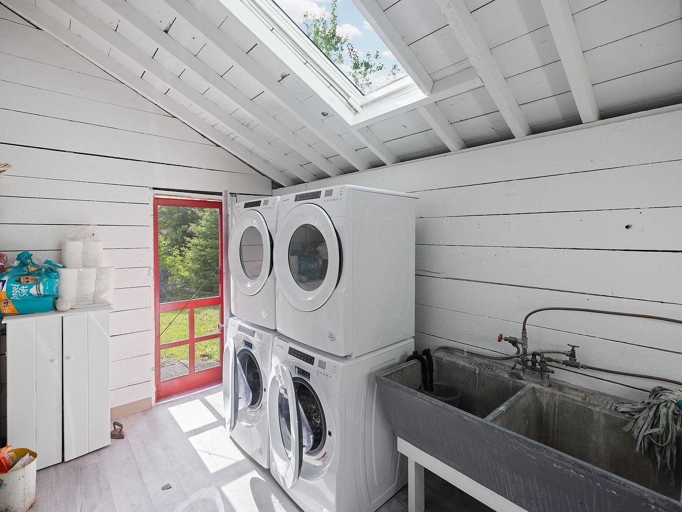 This airy laundry room features a sleek, modern design with a bright, inviting atmosphere. The vaulted ceiling with white beams enhances the open feel, while the wooden shiplap walls offer a charming rustic touch. A pair of front-loading washers are neatly stacked, maximizing space efficiency, complemented by a practical utility sink in a sturdy metal finish. A vibrant red door provides a pop of color and connects to the outdoors, inviting natural light and views. The minimalist cabinetry offers ample storage for laundry essentials, ensuring a family-friendly setup that’s both functional and aesthetically pleasing.