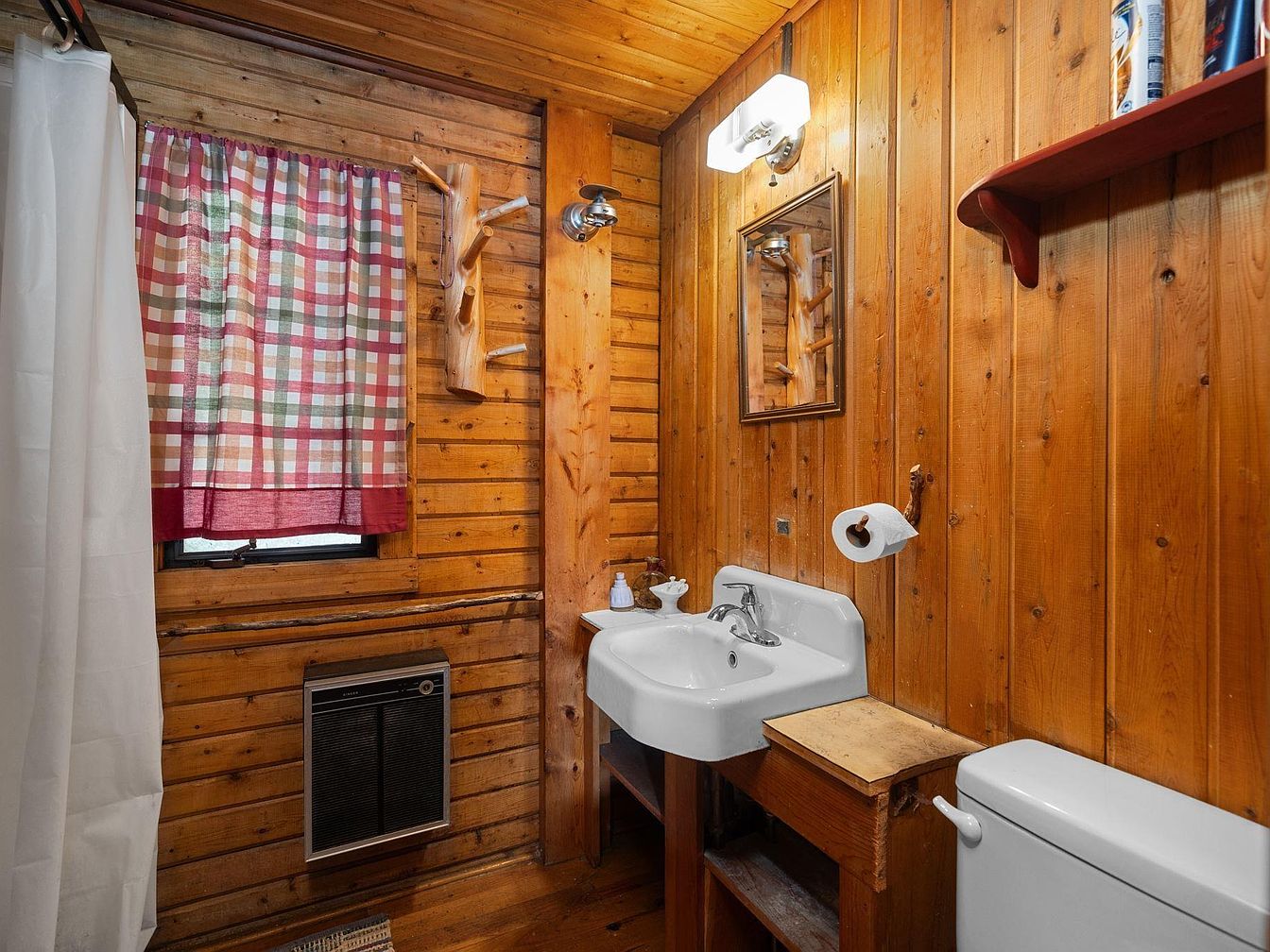 This inviting bathroom features warm, wooden walls that create an earthy ambiance, highlighted by a charming checkered curtain that adds a pop of color. The design balances rustic charm with practicality, showcasing a spacious sink accompanied by a wooden countertop and a classic mirror above. Family-friendly elements include a well-placed toilet and a convenient shelf for essentials, keeping the space organized. Warm lighting fixtures enhance the cozy atmosphere, while the wooden accents extend to functional elements like a wall-mounted towel holder. The layout promotes efficiency, making this bathroom a perfect blend of comfort and style.