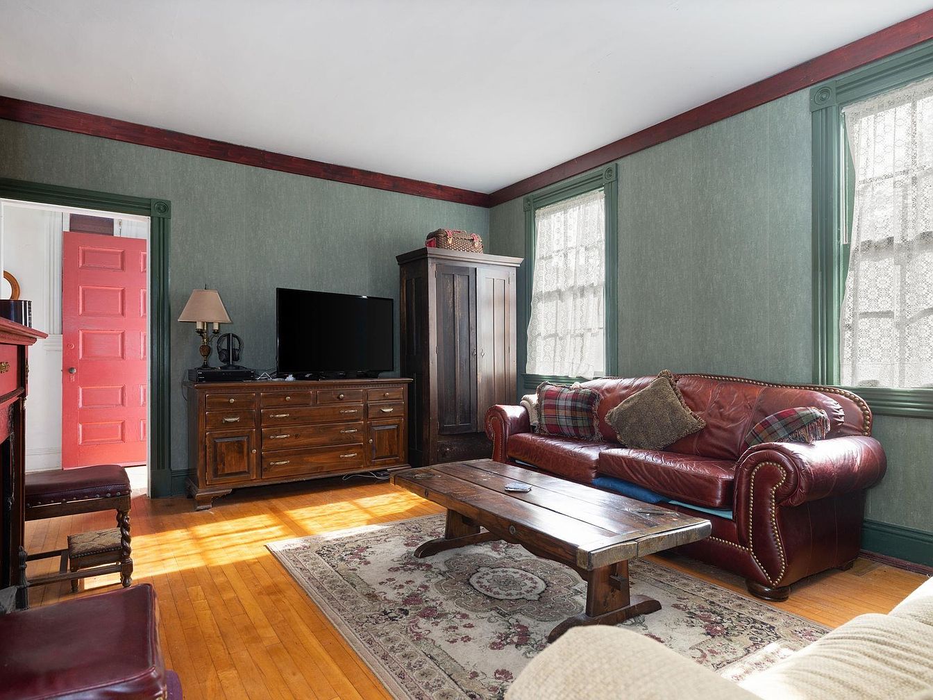 This inviting living room features a rich, earthy color scheme, enhanced by a combination of greenish-gray walls and dark wood accents. The leather sofa, adorned with plaid cushions, provides a comfortable seating area for family and friends. A rustic wooden coffee table complements the warm hardwood flooring. Natural light pours through the lace-trimmed windows, accentuating the room’s cozy ambiance. The hardwood furniture, including a stylish TV cabinet and a beautifully crafted side table, adds character. A vibrant red door serves as a striking focal point, inviting warmth and personality, perfect for family gatherings and daily relaxation.
