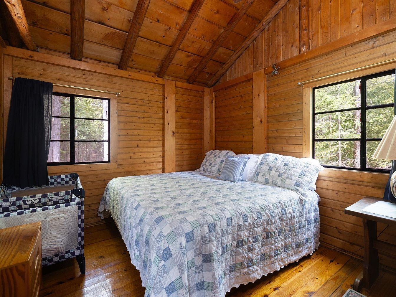 Nestled within natural surroundings, this cozy bedroom showcases a warm, rustic charm. The wooden walls and ceiling create an inviting atmosphere, enhancing the retreat-like feel of the space. A plush quilted bed with soft, layered pillows anchors the room, providing comfort for relaxation. Sunlight filters through large windows, framed by black curtains, revealing glimpses of the serene outdoor landscape. The rich, honey-toned wooden floor complements the earthy palette, while a bedside lamp illuminates the cozy nook. A portable crib adds family-friendly functionality, making this room perfect for both rest and nurturing moments.