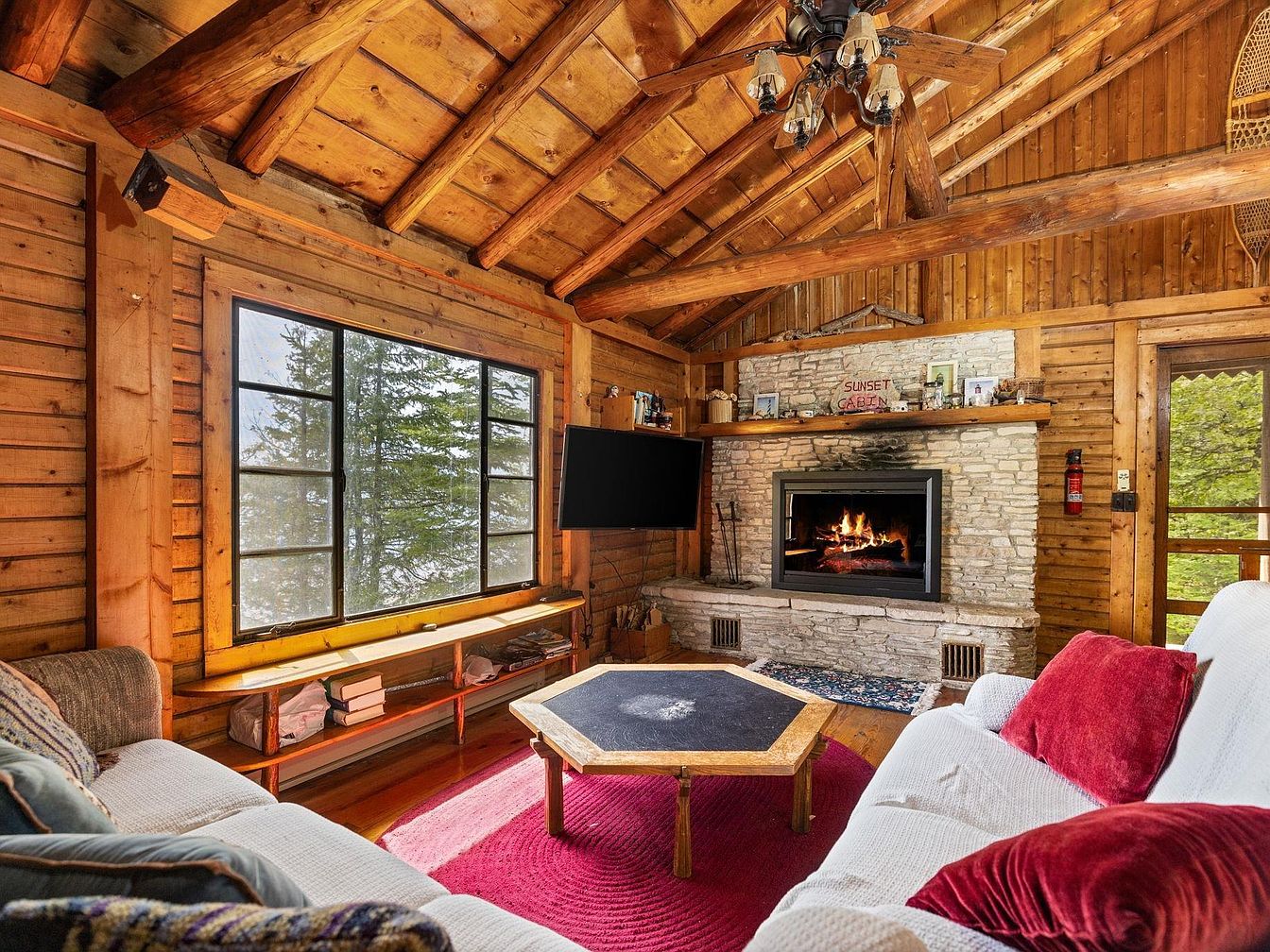 This inviting living room features a stunning blend of rustic charm and modern comfort. Highlighted by exposed wooden beams and a stone fireplace, the space is perfect for family gatherings. A large window allows natural light to flood in, showcasing the serene outdoor views. The soft, plush seating arrangement encourages relaxation, while a low coffee table adds functionality and style. Warm earth tones dominate the color palette, complemented by cozy textiles like the vibrant area rug and throw pillows. Personal touches like family photos on the mantle enhance the room’s warmth, making it an ideal retreat.