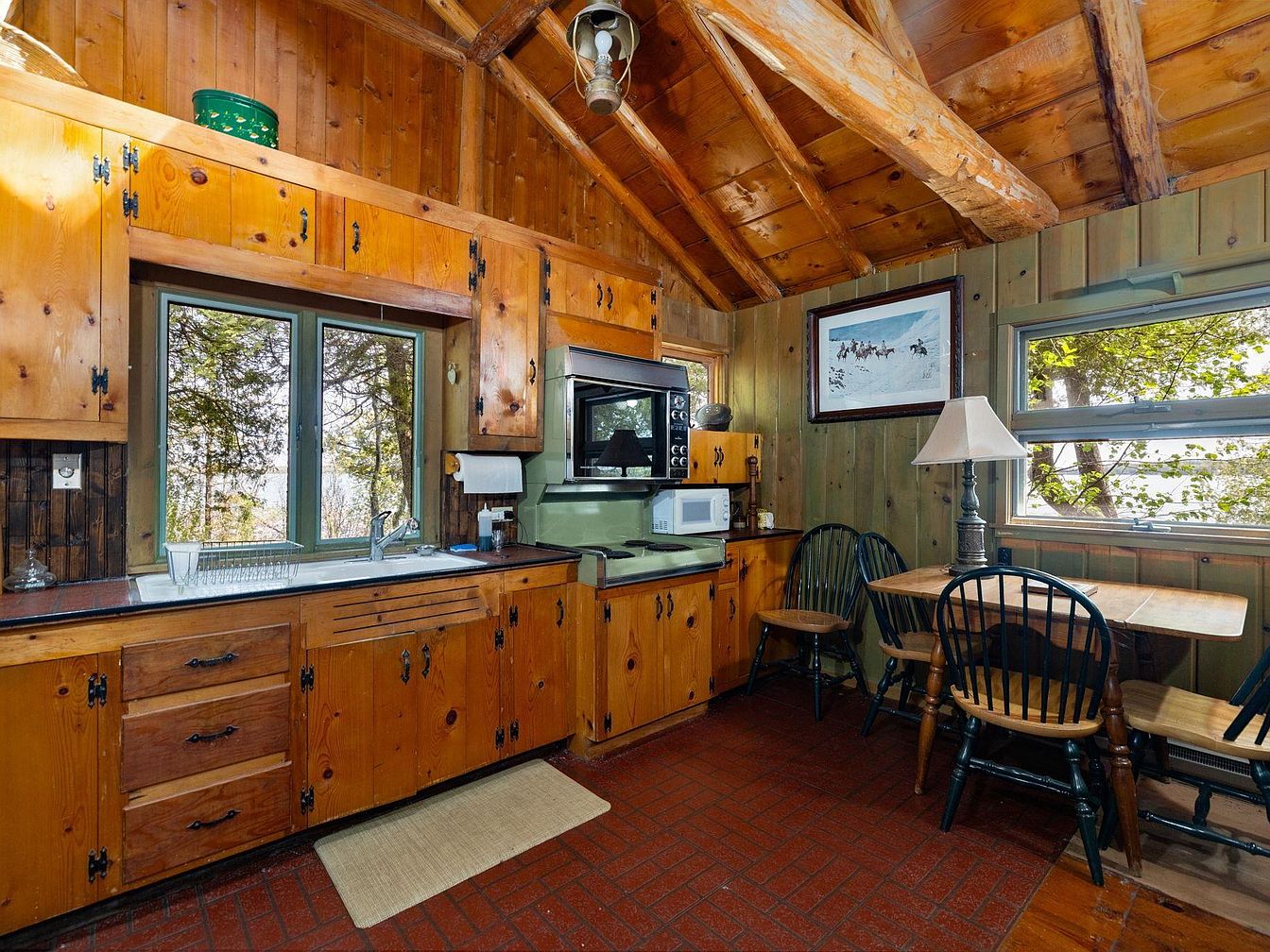 This inviting kitchen showcases a rustic design that blends warmth and functionality. The wooden cabinetry, adorned with charming black hardware, exudes a cozy, cabin-like feel, while the open layout encourages family gathering. Natural light floods the area through generous windows framed by lush greenery, offering a serene view. A green retro stove complements the hardwood countertops, enhancing the vintage aesthetic. The dining nook features a sturdy table surrounded by black spindle chairs, perfect for casual meals. Rich, earthy tones envelop the space, creating a welcoming atmosphere ideal for cooking and shared moments with loved ones.