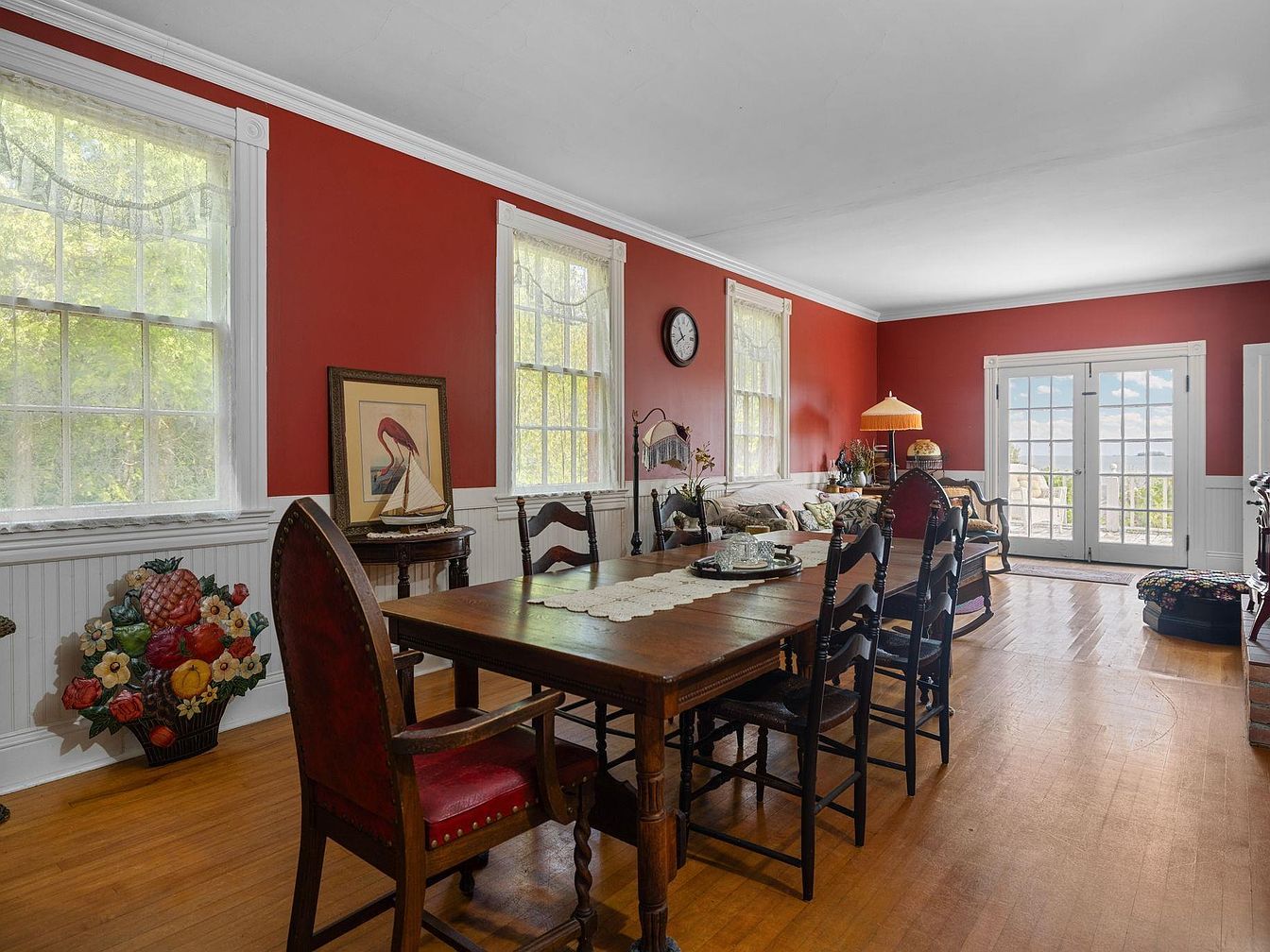 The spacious dining area features a rich, warm palette highlighted by a striking red accent wall, creating an inviting atmosphere for family gatherings. A well-crafted wooden table dominates the center, surrounded by sturdy chairs, showcasing a blend of traditional design with elegant upholstery. Natural light floods through large windows draped with sheer curtains, enhancing the bright and airy feel of the space. Decorative elements, like the floral wall art and a lovely side table with nautical decor, add personality. The nearby double doors lead to a scenic view, harmoniously blending indoor comfort with the outdoors, perfect for entertaining.