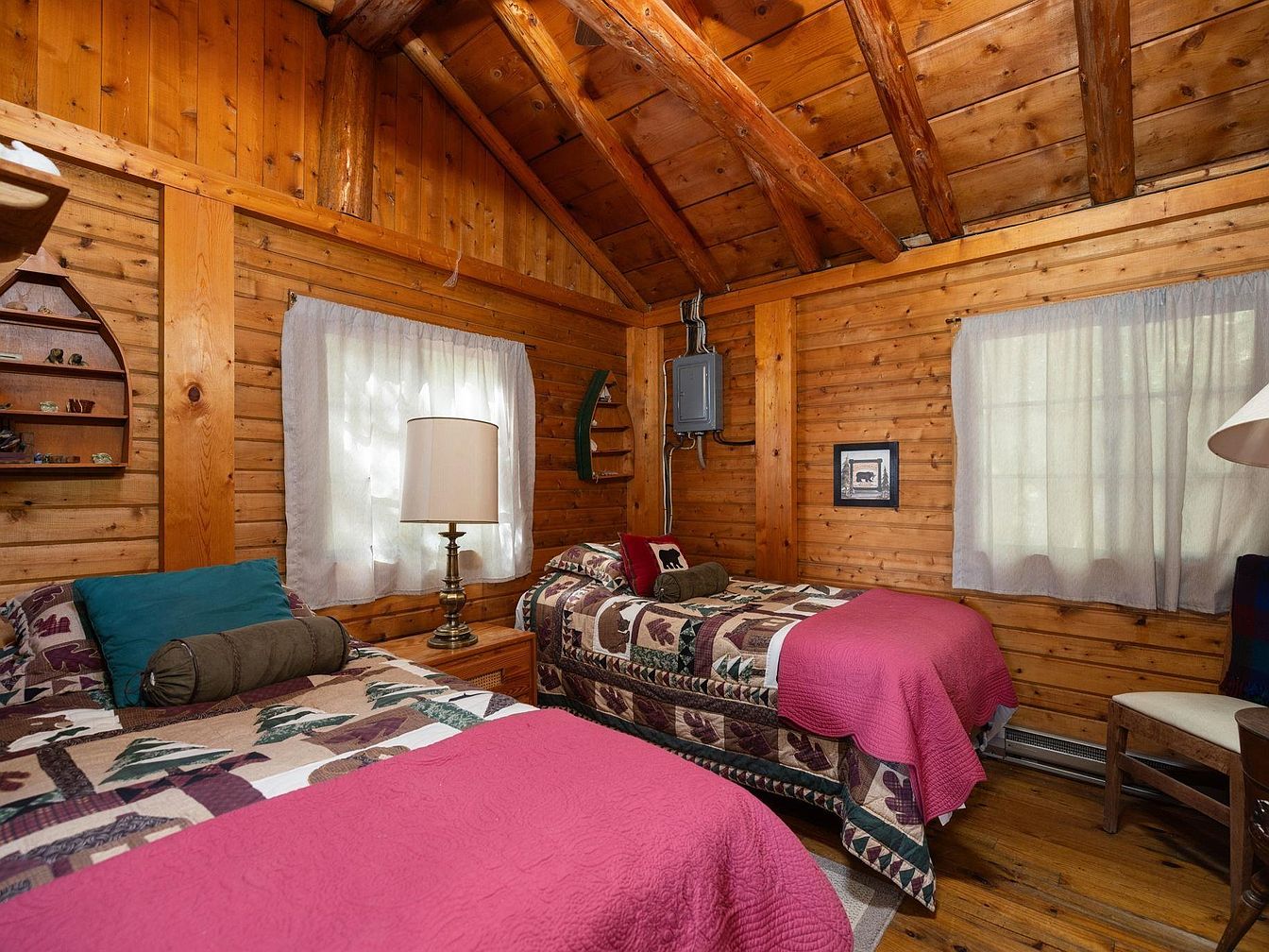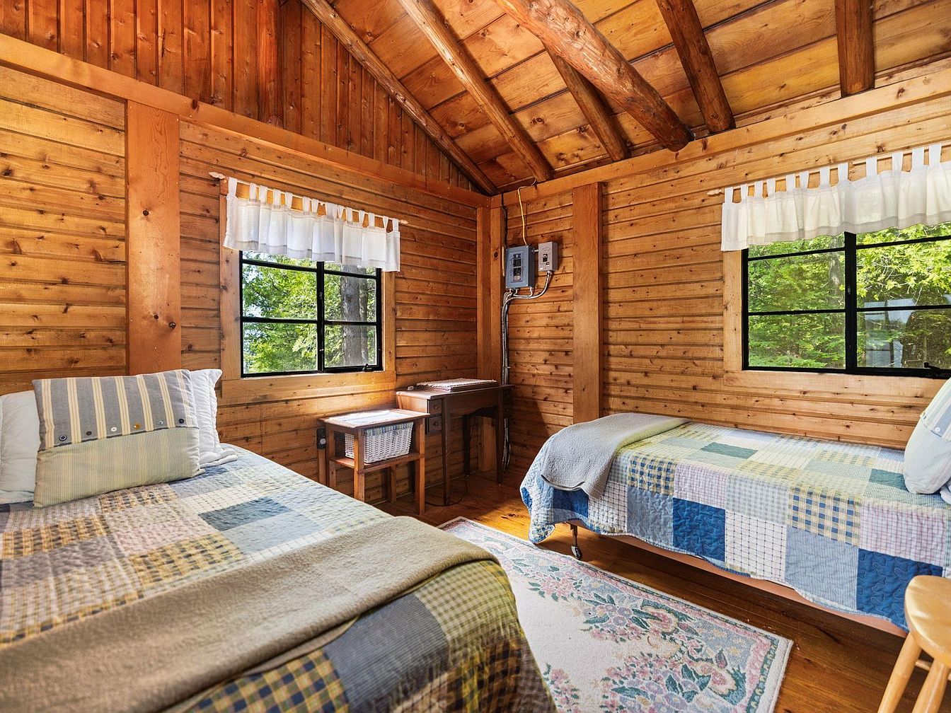 This inviting bedroom harmonizes rustic charm with comfort, featuring stunning wooden paneling and exposed beams that create a warm, enveloping atmosphere. Twin beds with patchwork quilts add a touch of homey nostalgia, perfect for family or guests. Large windows framed by soft, billowy curtains invite natural light and showcase views of the surrounding greenery, enhancing the serene ambiance. A small writing desk suggests a space for quiet reflection or study. The earthy color palette of browns, blues, and creams contributes to a tranquil vibe, making this room a perfect sanctuary for relaxation and rejuvenation.