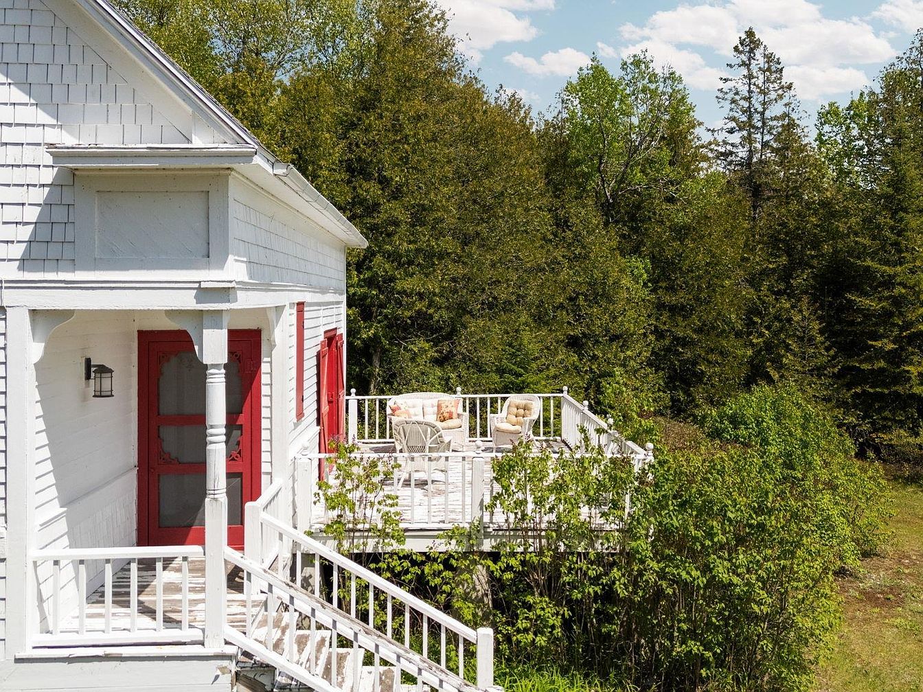 This inviting porch features a blend of traditional and modern aesthetics, highlighted by striking red doors and matching window shutters that offer a vibrant contrast to the crisp white exterior. The spacious layout seamlessly extends to a sunlit deck, perfect for relaxation and family gatherings. Cozy seating arrangements with soft cushions invite leisurely afternoons, while the surrounding greenery enhances the natural beauty and tranquility of the space. Architectural details like the chic columns and railing add character, making it an ideal spot for enjoying serene views and quality time with loved ones in a picturesque outdoor setting.
