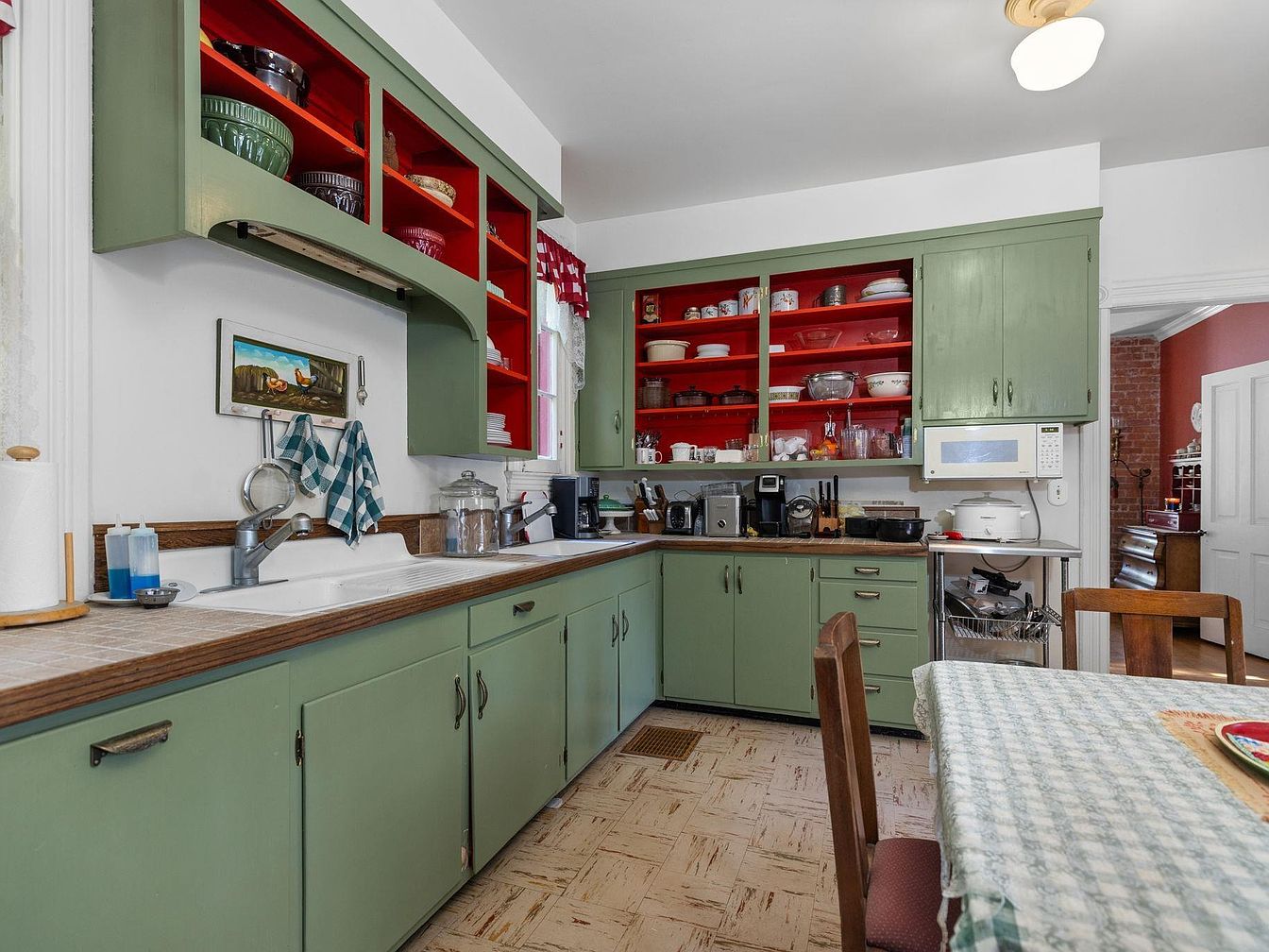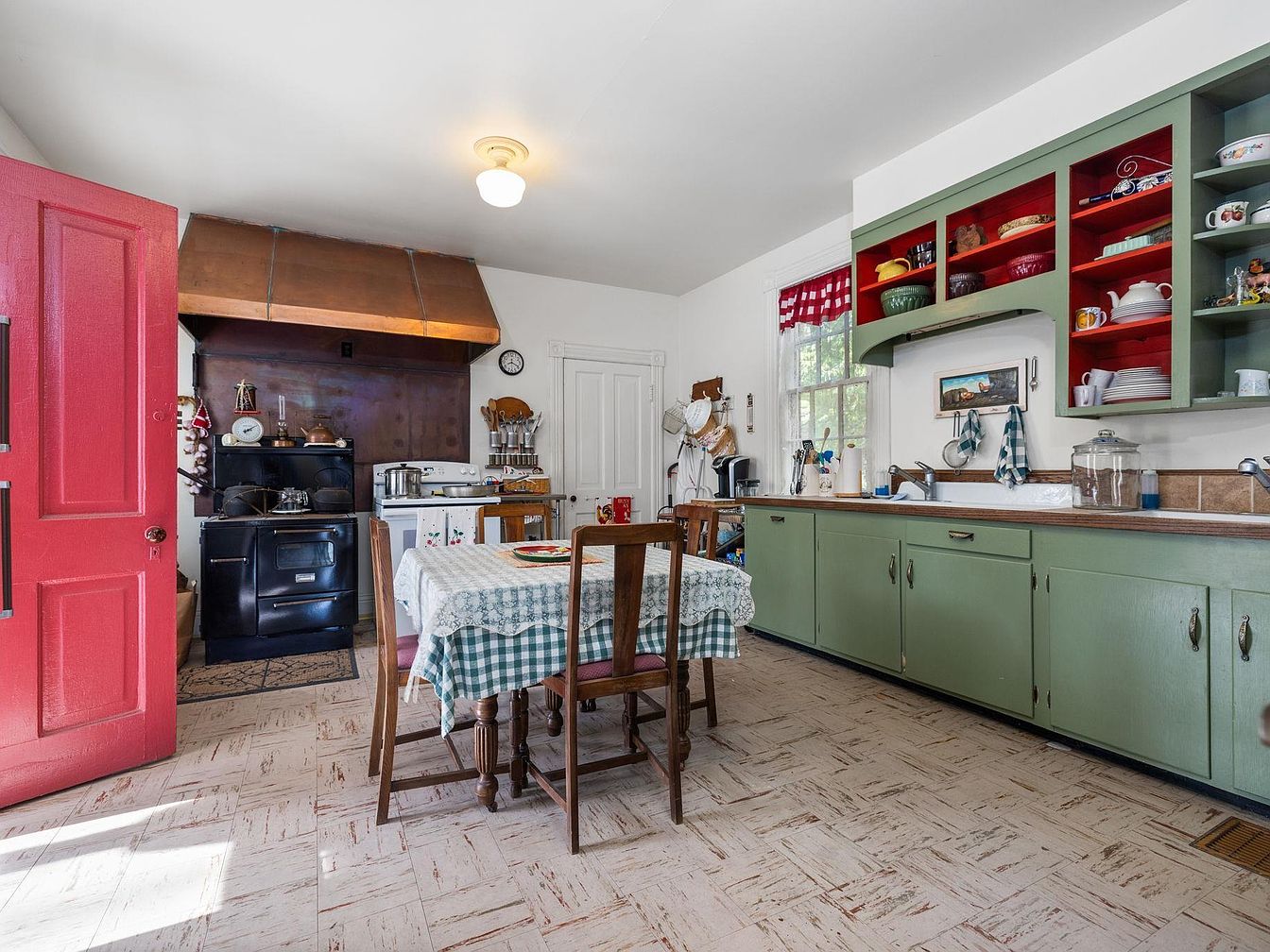 This delightful kitchen combines retro charm with modern function. The soft green cabinetry complements striking red-open shelving, creating a vibrant yet welcoming atmosphere. A spacious layout accommodates gatherings, with room for culinary creativity and family meals. The classic white sink, flanked by practical fixtures, reflects a timeless appeal. Decorative elements, such as checked dish towels and a framed artwork, enhance the casual, homely feel. The hexagonal linoleum flooring adds texture, while ample natural light filters through the windows, brightening the space and inviting family connections around the dining table, making it perfect for everyday living.