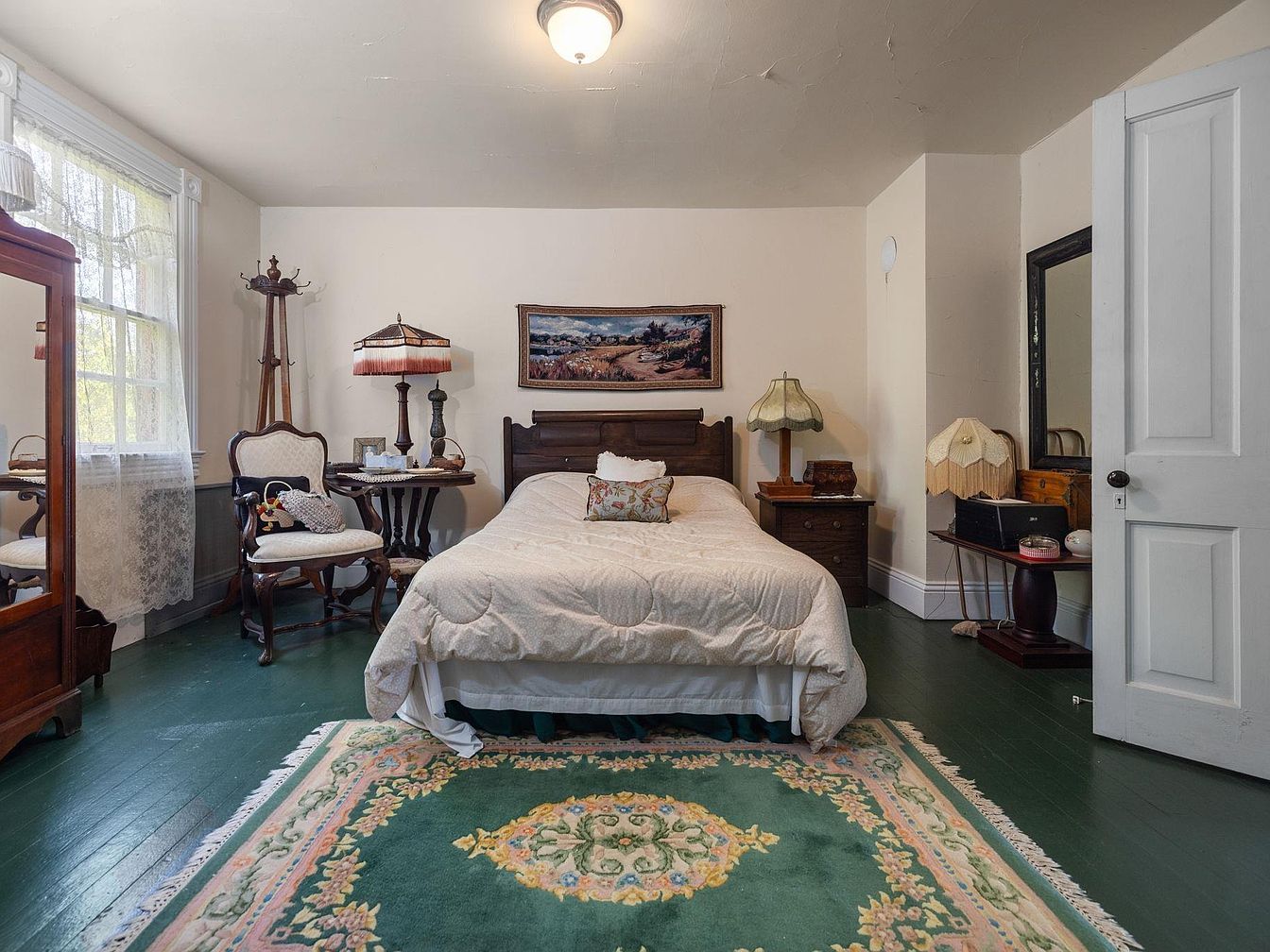 This inviting master bedroom features a blend of vintage charm and comfort, showcasing a beautifully made bed adorned with a soft quilt. A rich green hardwood floor complements the warm beige walls, enhancing the room’s cozy aura. Elegant furniture, including a classic wooden bedside table and an intricately carved mirror, adds character, while decorative lamps cast a warm glow in the evening. A plush area rug with floral patterns brings warmth and cohesion to the space. A window draped in sheer lace allows natural light to fill the room, creating a welcoming atmosphere perfect for relaxation.
