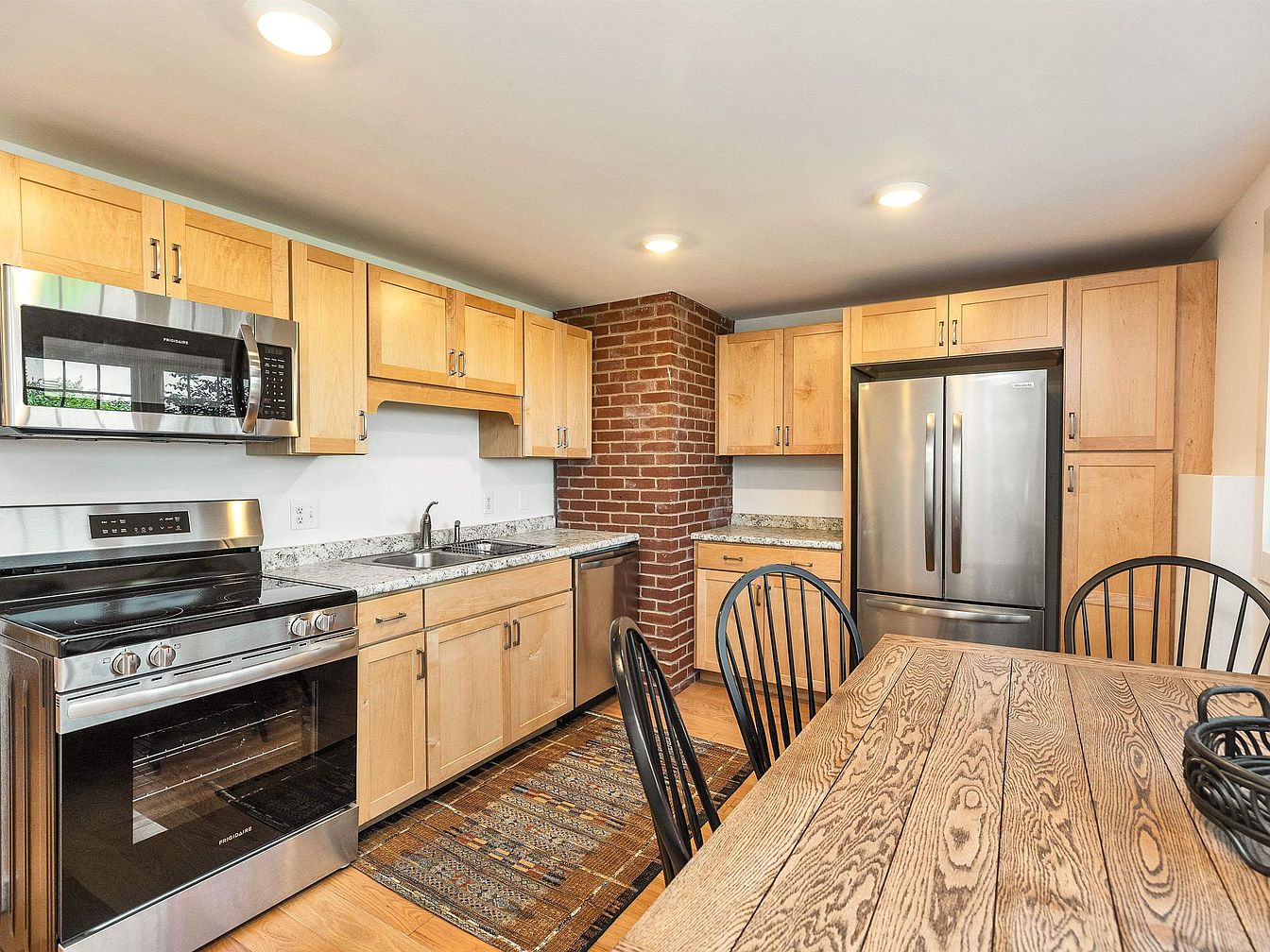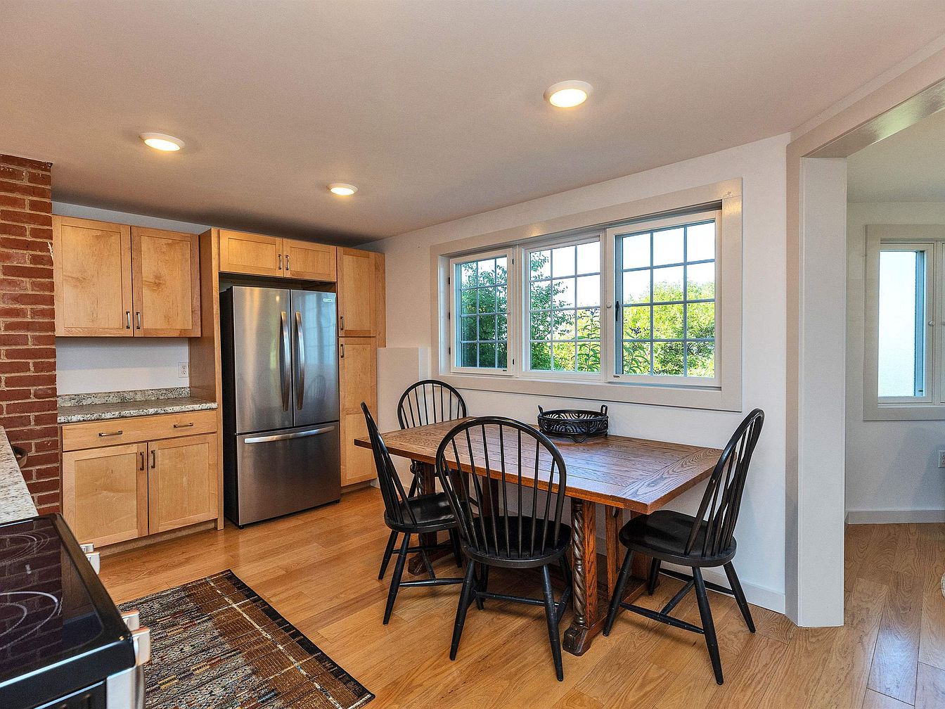 This inviting kitchen space features a blend of modern and rustic design elements, highlighted by warm wooden tones and a rich, textured brick accent wall. The sleek stainless steel appliances offer a contemporary touch, while the light maple cabinetry provides ample storage and a clean aesthetic. The spacious dining area showcases a charming wooden table, surrounded by classic black spindle chairs, perfect for family gatherings. Large windows pour natural light into the room, enhancing the open layout and offering inspiring views of the outdoors. A stylish area rug adds warmth, completing the welcoming atmosphere in this heart of the home.