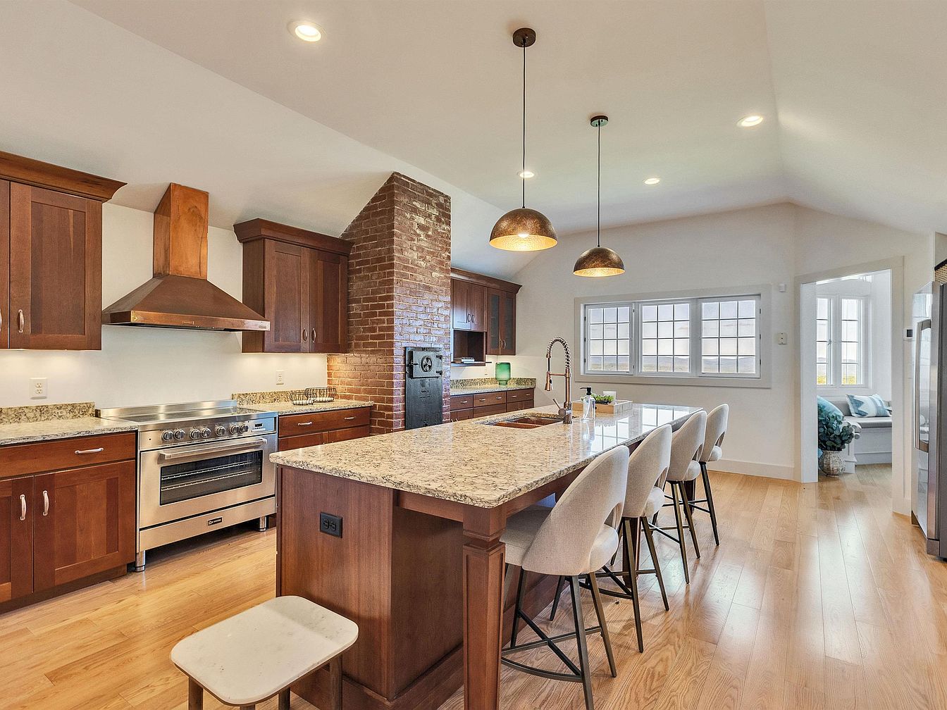 This kitchen combines elegance and functionality, featuring rich wooden cabinetry that complements the warm granite countertops. The spacious island with stylish barstools invites family gatherings, while the sleek stainless steel appliances stand ready for culinary adventures. A striking brick accent wall infuses character, contrasting beautifully with the light color scheme. Ample natural light pours in from multiple windows, enhancing the airy feel. Thoughtful touches, like under-cabinet lighting, create a welcoming ambiance. Perfect for family interactions or entertaining, this inviting space balances modern design with a cozy, homely atmosphere, making it the heart of the home.