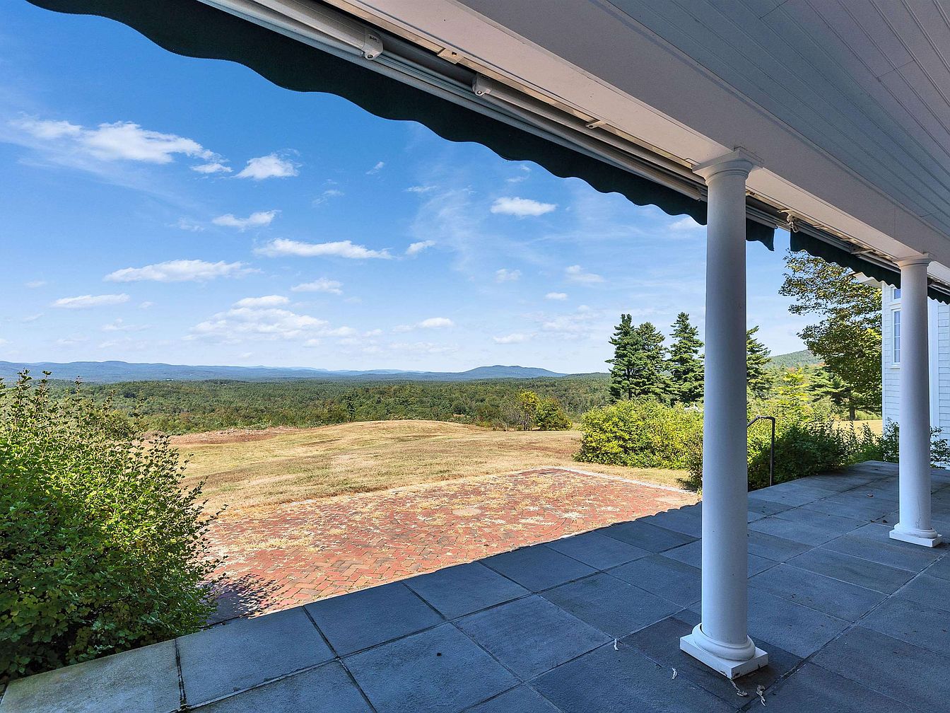 Stepping out onto the expansive porch reveals a breathtaking panorama of rolling hills and lush greenery. Supported by elegant white columns, the spacious tiled area offers ample room for outdoor gatherings or quiet moments of reflection. The blue sky, flecked with soft clouds, complements the natural beauty beyond. A charming awning provides shade, perfect for enjoying sunny days. Here, family-friendly features blend seamlessly with aesthetics, making it an inviting space for both socializing and relaxation. The rich tones of the brick patio harmonize beautifully with surrounding foliage, creating a tranquil retreat that embodies the essence of outdoor living.