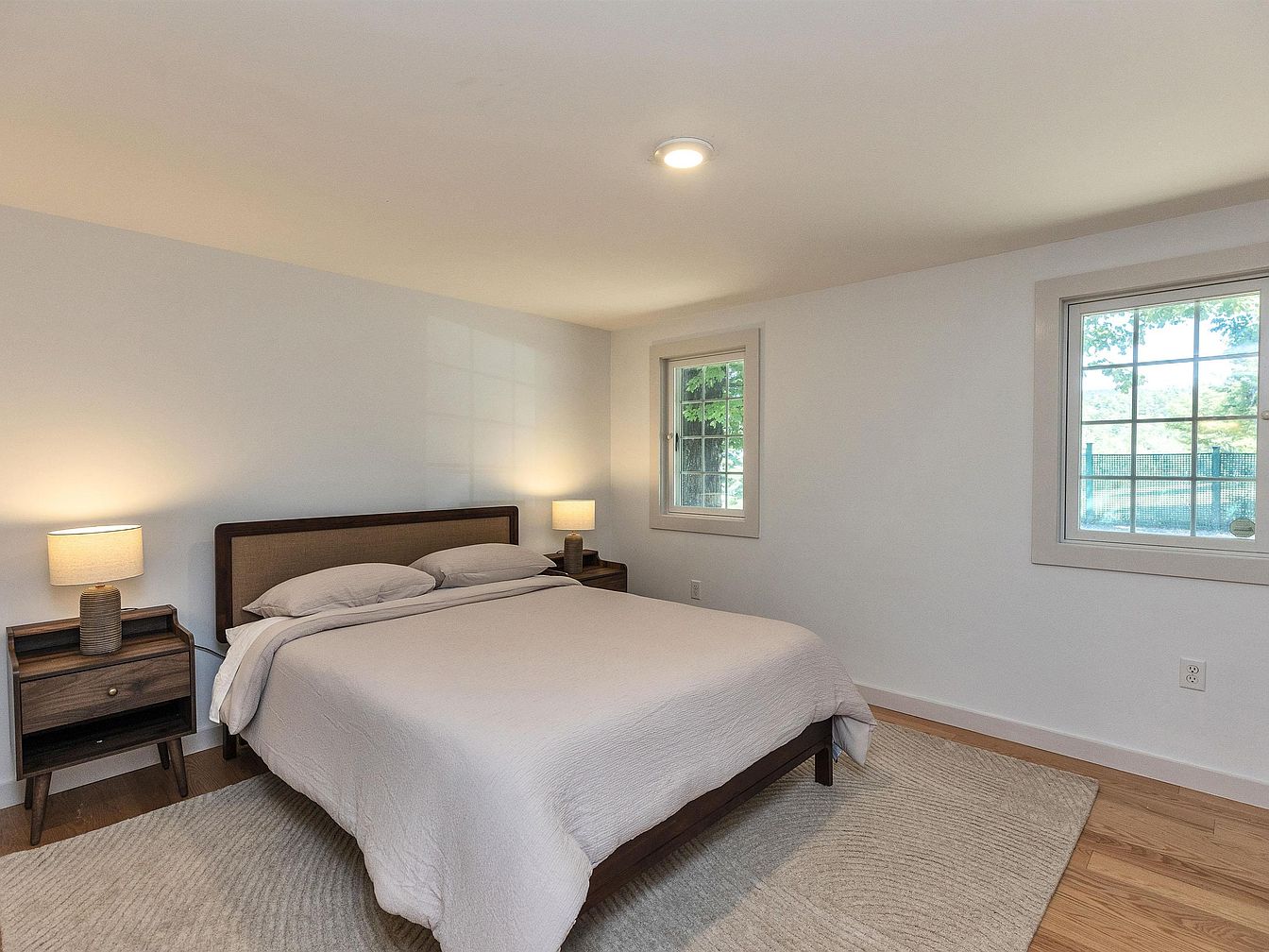This serene master bedroom features a harmonious blend of contemporary design and comfort. Soft, muted tones envelop the space, with a fresh white palette complemented by natural wood accents. The bed is framed by a stylish headboard, creating a cozy focal point alongside matching nightstands, each topped with warm, inviting lamps that add a soft glow in the evenings. Large windows invite abundant natural light, enhancing the airy ambiance and providing a view of the outdoors. The room’s layout prioritizes tranquility, making it an ideal family-friendly retreat for relaxation and restful sleep.