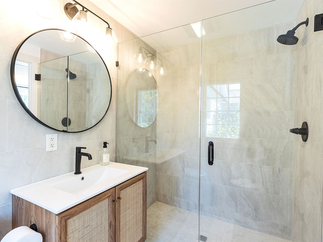 This modern bathroom features a sleek design with a spacious walk-in shower enclosed by transparent glass, enhancing the sense of openness. A circular black-framed mirror complements the contemporary vanity, which combines light-toned cabinetry with textured wood accents. The color palette is neutral, showcasing elegant gray tiles that offer a calming atmosphere. Recessed lighting and a statement light fixture above the mirror provide warm illumination, making the space inviting. Family-friendly elements include easy-to-clean surfaces and plenty of natural light streaming through the window, creating a bright and airy feel for daily routines.