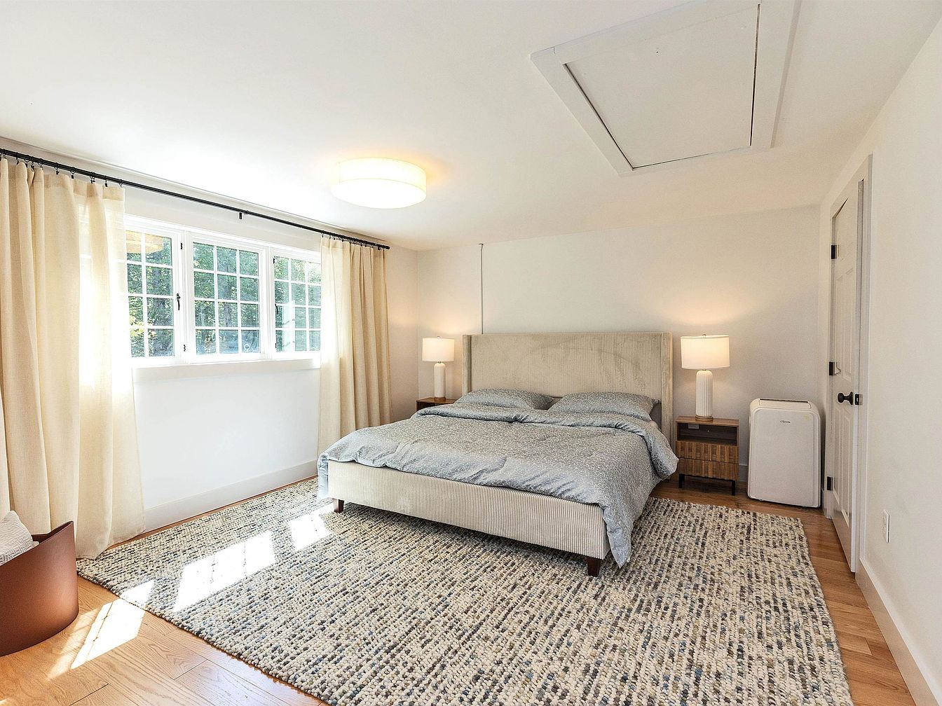 This serene master bedroom features a well-thought-out layout that promotes relaxation and comfort. The inviting color palette combines soft whites and muted earth tones, enhancing the natural light streaming through the large, multi-pane windows. A plush bed, adorned with crisp linens and decorative pillows, serves as the focal point, while stylish nightstands and minimalistic lamps add functional elegance. The textured area rug complements the hardwood flooring, offering warmth underfoot. Soft, flowing curtains frame the windows, maintaining privacy while allowing light to filter in. Overall, the space seamlessly blends modern design with cozy, family-friendly elements.