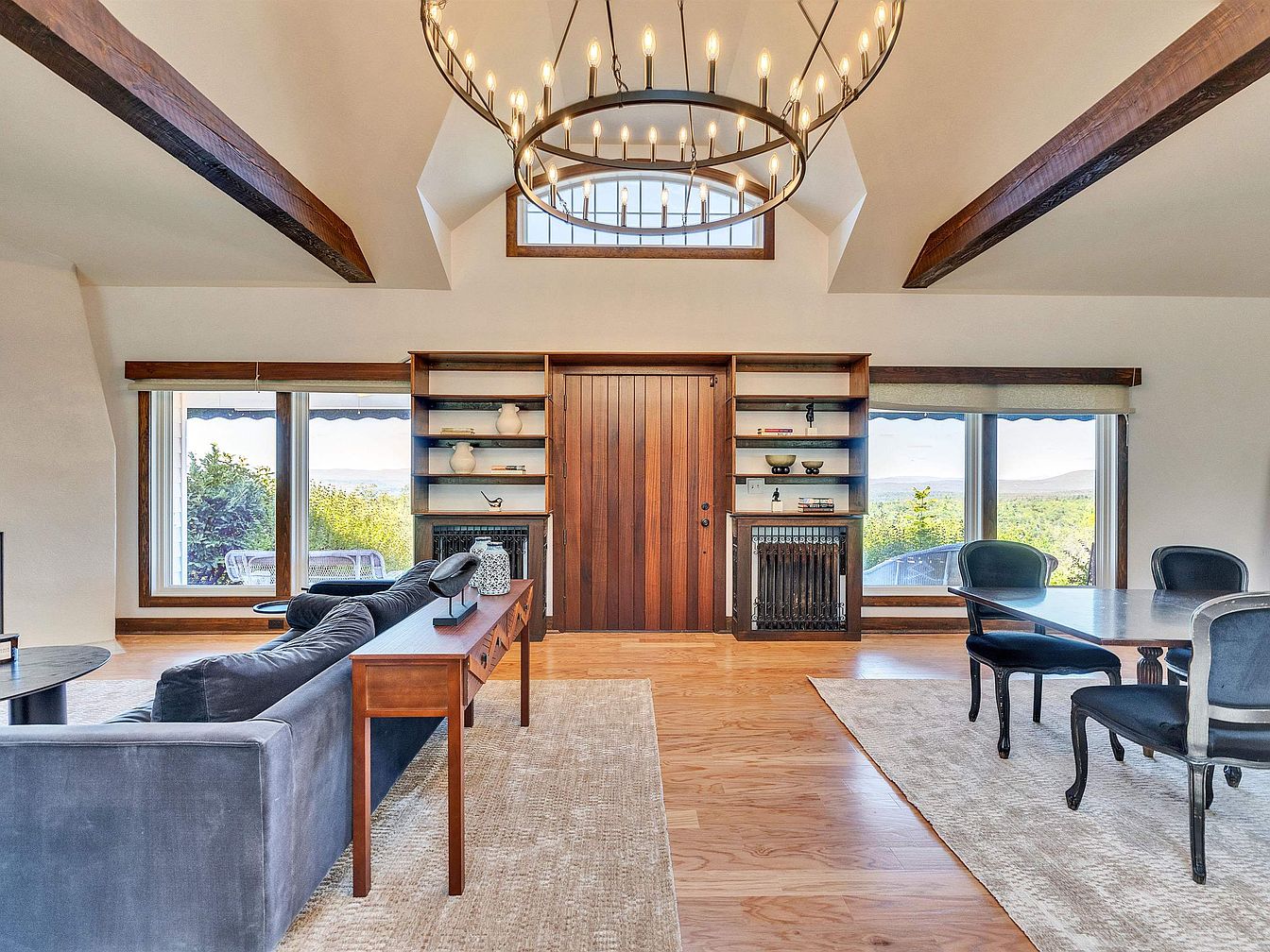 This inviting open living space blends modern comfort with natural beauty, featuring large windows that offer stunning views of the outdoors. The rich wooden beams overhead enhance the room’s height and architectural charm. A plush gray couch and minimalist coffee table create a cozy seating area, while a sturdy wooden console adds functionality with elegance. Light-colored walls complement the warm wood tones, and a stylish chandelier illuminates the space. The dining area, with its black chairs and sleek table, invites gatherings. Family-friendly elements include ample seating and easy access to nature, promoting togetherness in a serene environment.