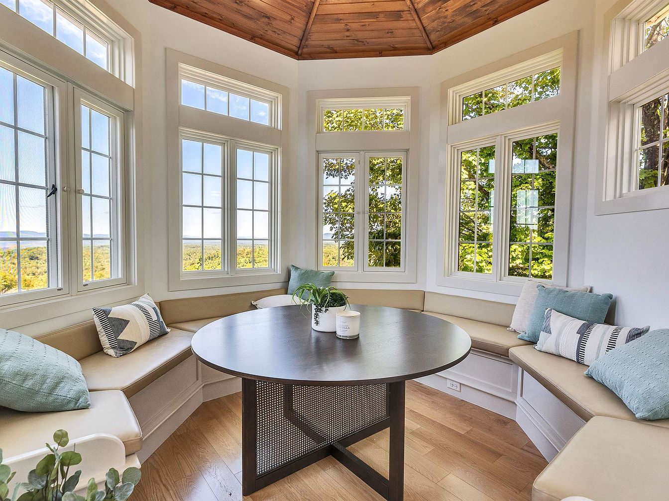 This inviting breakfast nook features a cozy circular seating arrangement adorned with plush cushions in soft colors, promoting comfort and conversation. Sunlight pours in through expansive windows, offering panoramic views of the surrounding landscape and creating an open, airy feel. The combination of light wood flooring and a warm wooden ceiling adds a touch of elegance, while the round table serves as a perfect centerpiece for family gatherings. Neutral tones are accentuated with pops of color through decorative pillows, enhancing the space’s family-friendly atmosphere. Ideal for morning coffee or casual meals, this nook is a serene escape.
