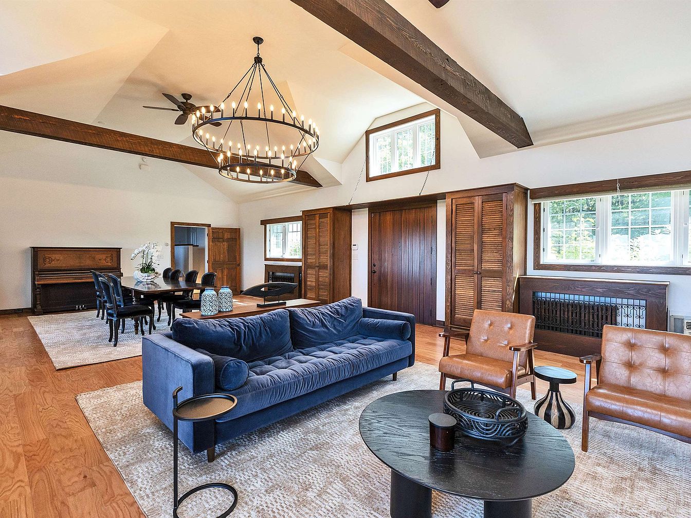 An inviting living room features a stunning blue velvet sofa, perfectly positioned for comfort. The space is enhanced by rich wooden beams and a striking chandelier that draws the eye upwards, imparting a sense of grandeur. Light floods in through large windows, offering views of the outdoors and maintaining a warm ambiance. The layout seamlessly connects to a dining area with elegant black chairs surrounding a polished table, ideal for family gatherings. A tasteful balance of textures is achieved with soft rugs underfoot, while the warmth of wooden elements, including cabinetry and a vintage piano, add character and charm.