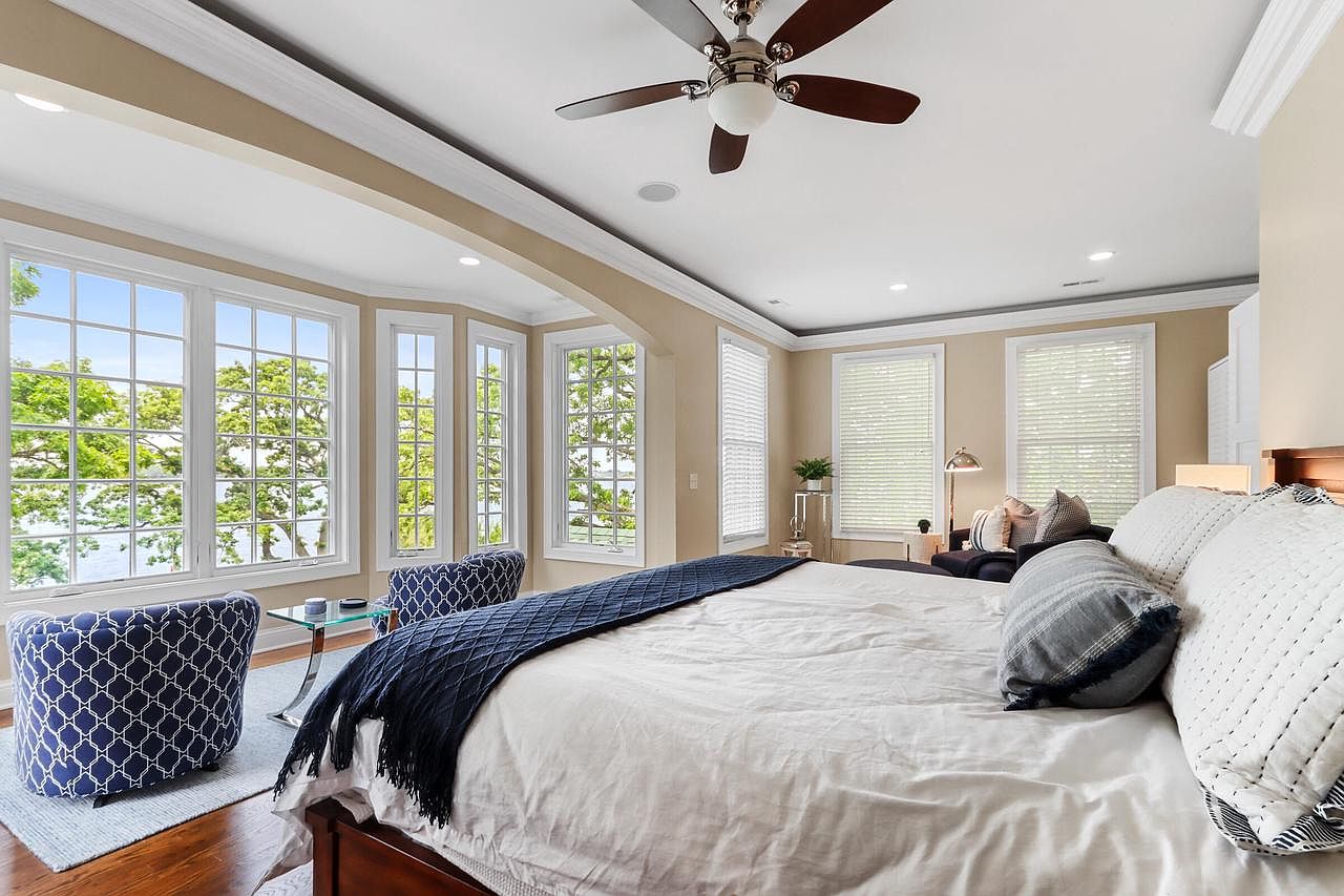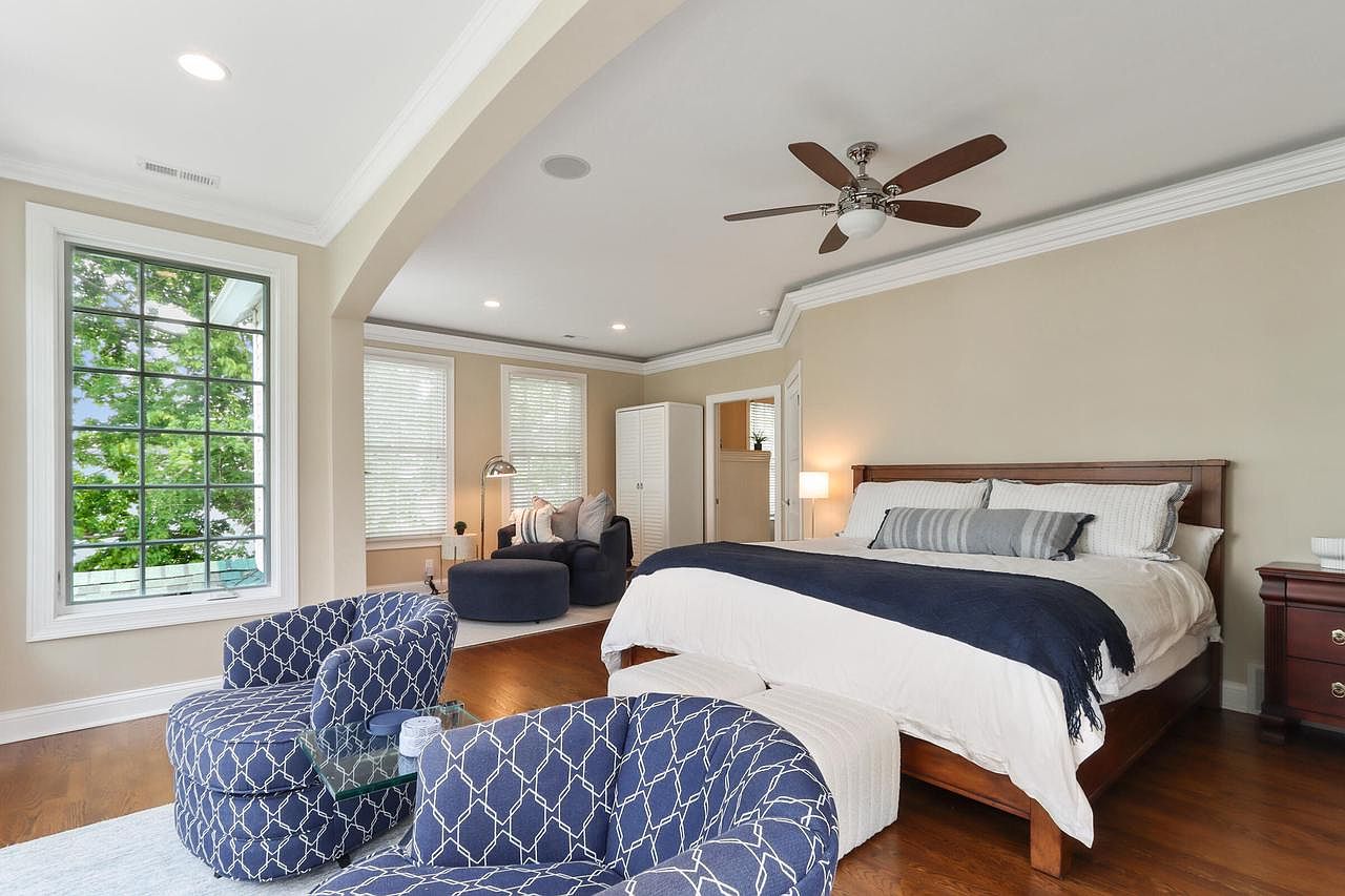 Spacious and inviting, this master bedroom features a serene sitting area with two plush, blue patterned chairs around a sleek glass table, perfect for morning coffee or relaxed reading. Large windows bathe the space in natural light and offer beautiful views of the greenery outside. The king-sized bed, with crisp white linens and navy blue accents, anchors the room and is flanked by classic wooden nightstands. Neutral walls and crown molding add a sense of elegance, while warm hardwood floors create a cozy foundation. Thoughtful details and a clear separation of lounging and sleeping areas make this an ideal, family-friendly oasis.